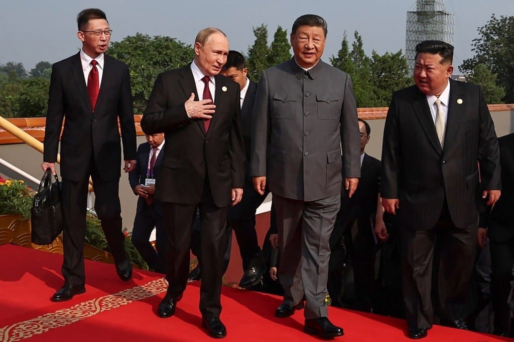 2025年9月3日,北京天安門廣場,九三閱兵期間,(左起)俄羅斯總統普京、中國國家主席習近平、北韓領導人金正恩走在一起。攝:Alexander Kazakov/Pool/AFP via Getty Images