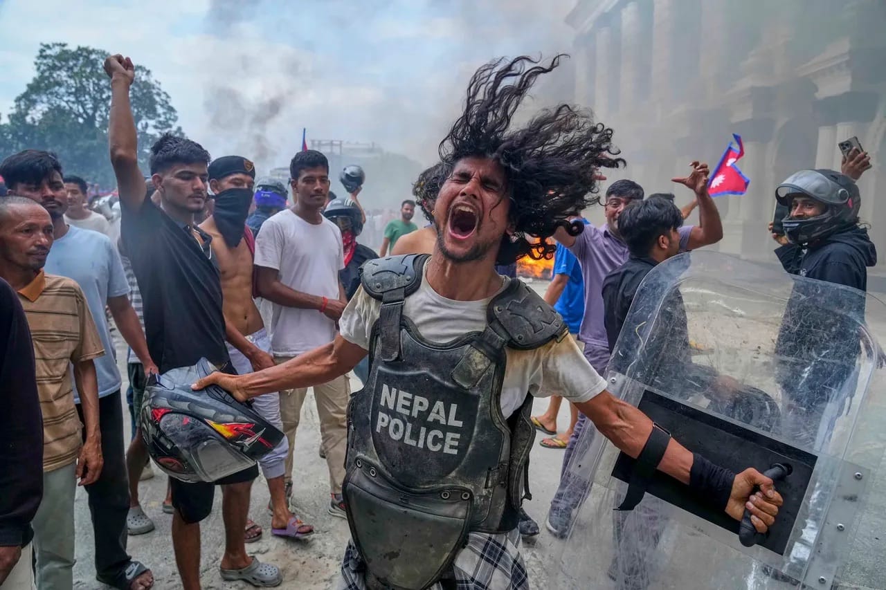 2025年9月9日,尼泊爾加德滿都,一名身穿防彈衣、手持從警察手中奪來的盾牌的示威者高呼口號。攝:Niranjan Shrestha/AP/達志影像