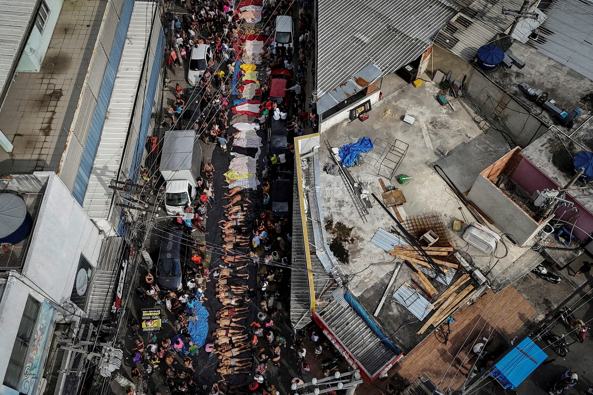 2025年10月29日,巴西里約熱內盧佩尼亞貧民窟,警方昨為打擊販毒集團的毒品走私展開致命行動,民眾在遇難者的遺體旁哀悼。攝:Ricardo Moraes/Reuters/達志影像