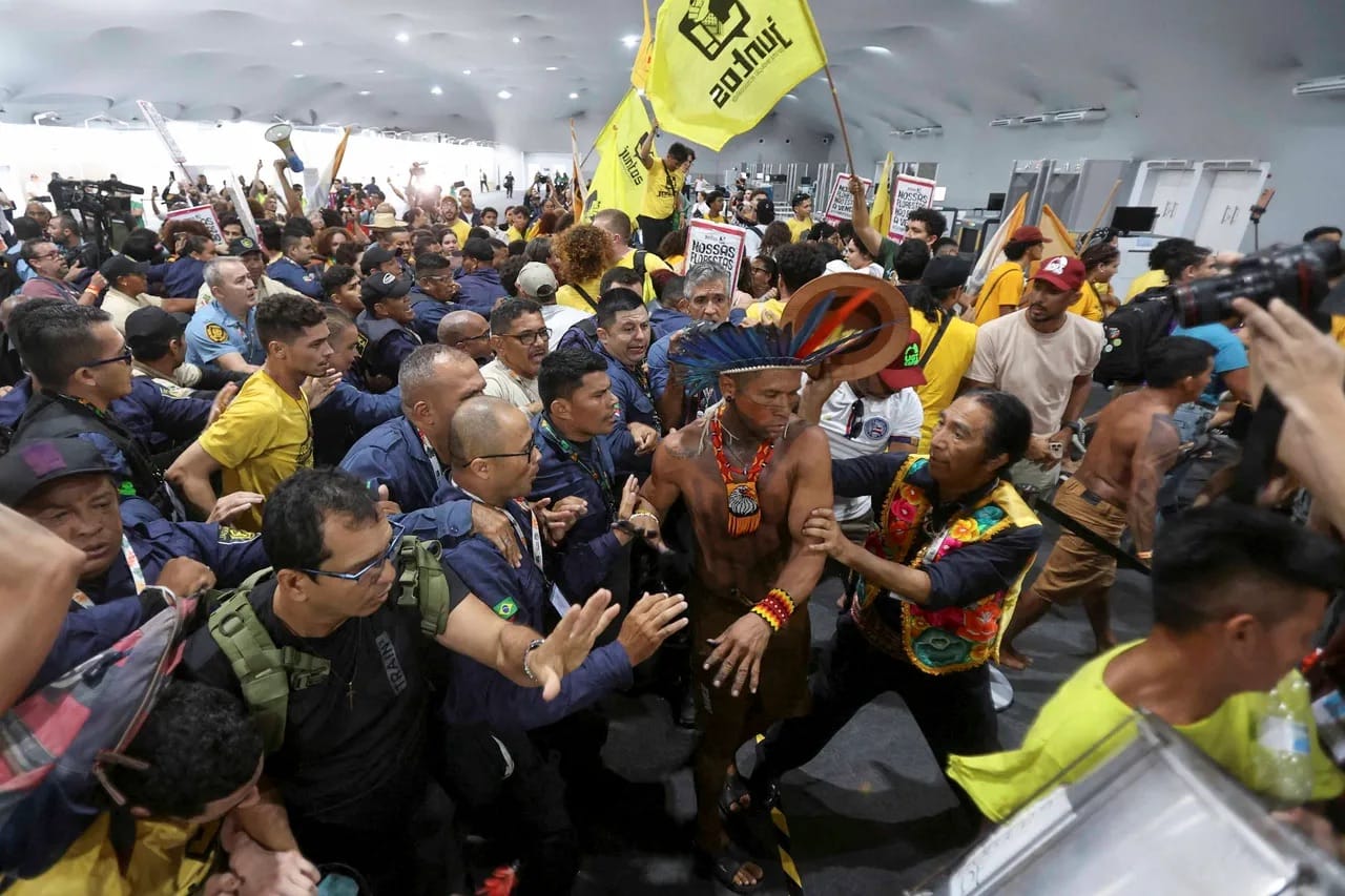 2025年11月11日,巴西貝倫,包括原住民在內的示威者強行闖入聯合國氣候變遷大會(COP30)會場。攝:Anderson Coelho/Reuters/達志影像