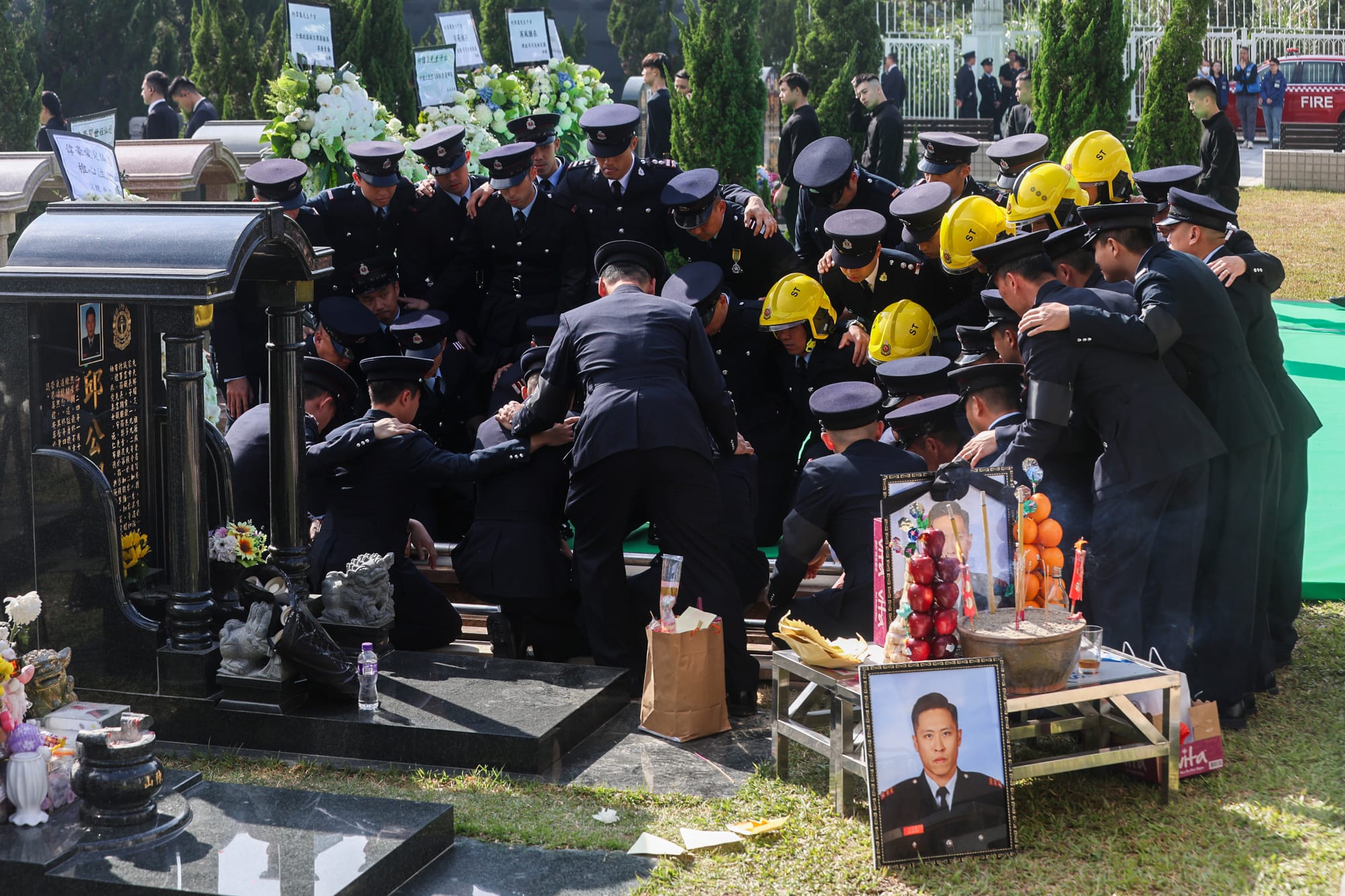 2025年12月19日,香港和合石浩園,37歲消防員何偉豪在大埔宏福苑大火中英勇殉職,今日舉行最高榮譽喪禮,他的同袍最後圍着靈柩緬懷相處逸事。攝:鄧家烜/端傳媒
