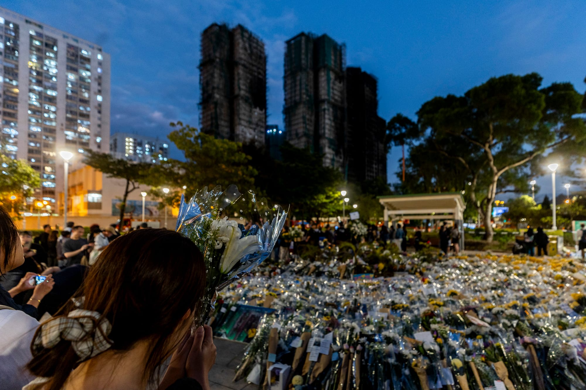 2025年12月1日,香港大埔宏福苑火災現場外,大量市民到場獻花。攝:林振東/端傳媒