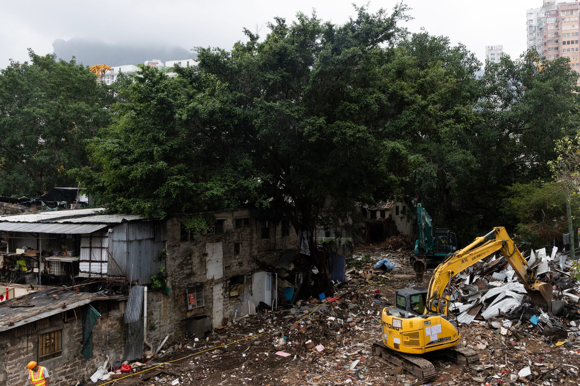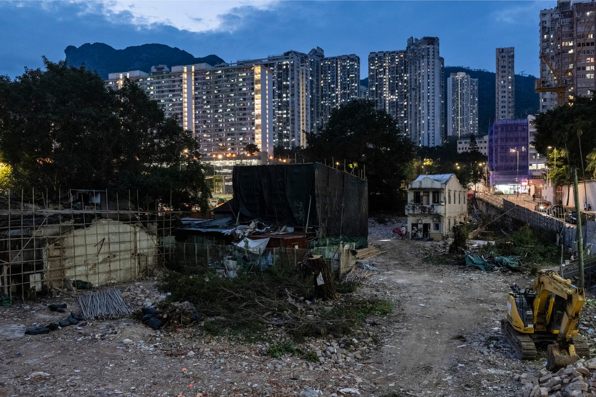 2019年,時任特首林鄭月娥宣佈清拆九龍三條被稱為市區寮屋區的城中村,用以重建為公共房屋提供合共約8,700個單位。三村的拆遷工程在2025年陸續展開,在黃大仙的一座行人天橋上可以俯瞰竹園聯合村在兩個月間的消亡;牛池灣村第一階段清拆的西村只餘零星住戶;茶果嶺村村民亦陸續以各自的方式告別逾400年歷史的城中客家村。攝:鄧家烜/端傳媒
