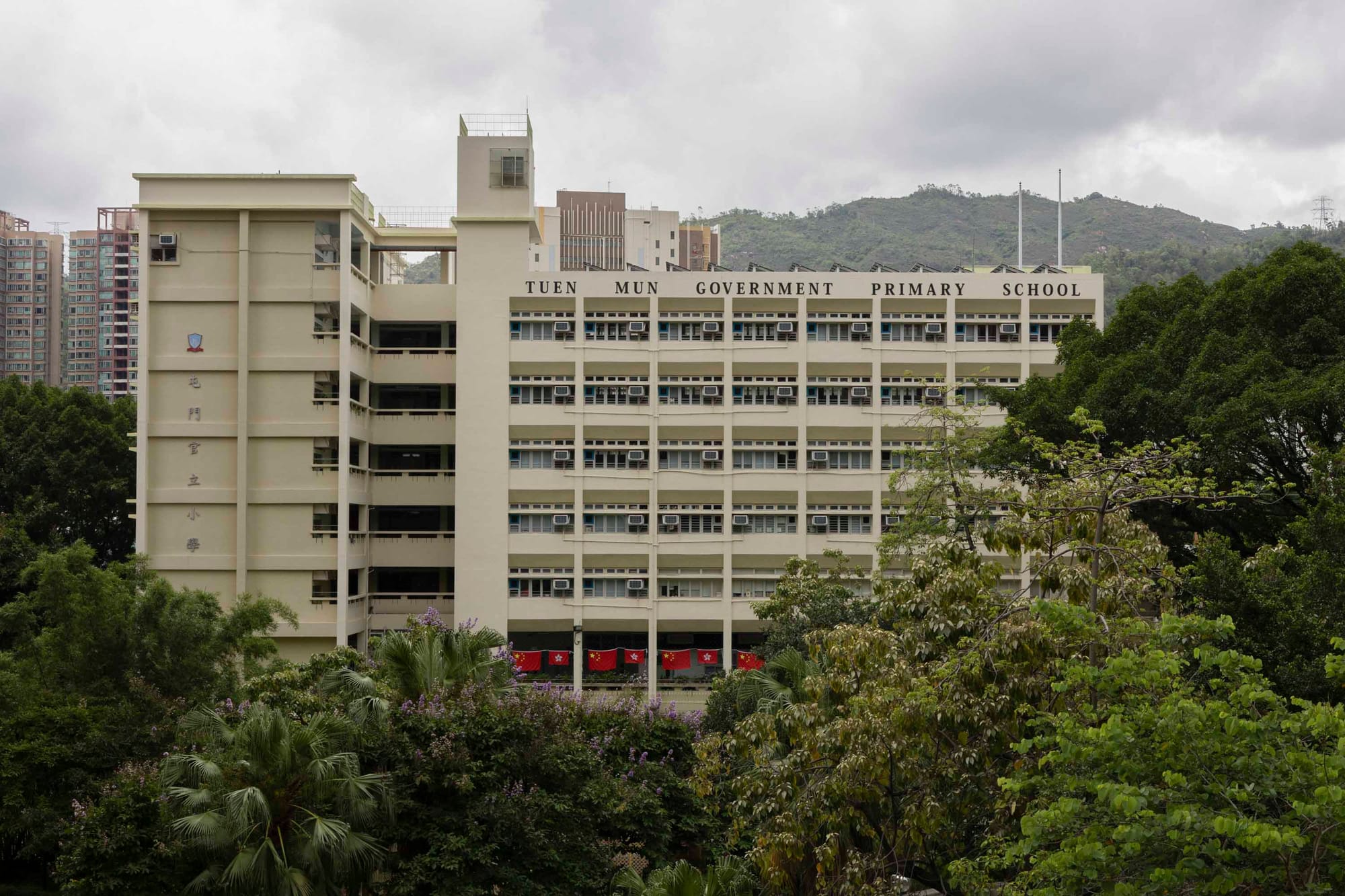 2025年7月1日是香港主權移交28週年,也是國安法5週年,學校已成為愛國主義教育的主要場域,官校裏外一片紅。港九新界的29間官立中學和33間官立小學,國旗與區旗的懸掛已成為一種標準實踐。然而官校以外的學校,鮮有展示國旗和區旗。現時,教育局要求全港學校每年提交「維護國家安全及國安教育相關措施」年度報告,有學校在報告中羅列全年總計舉行升國旗儀式及國旗下講話活動的次數。攝:鄧家烜/端傳媒