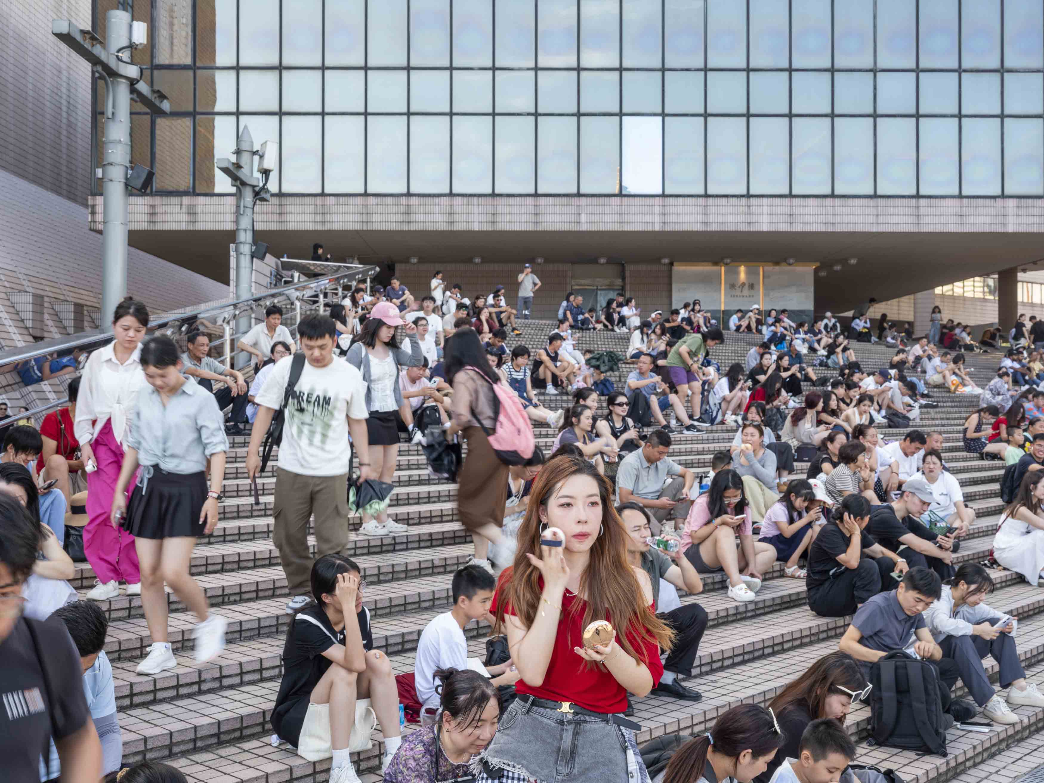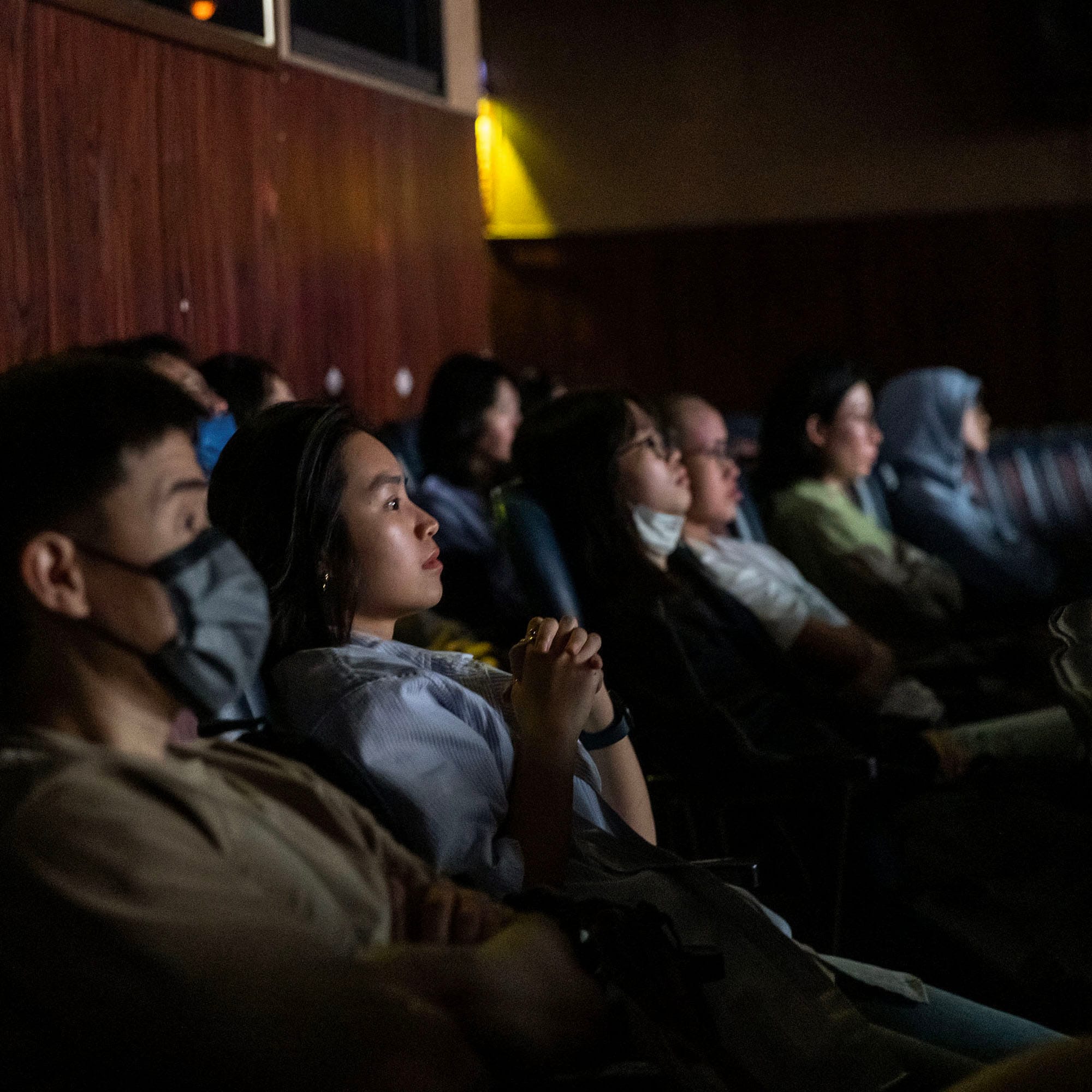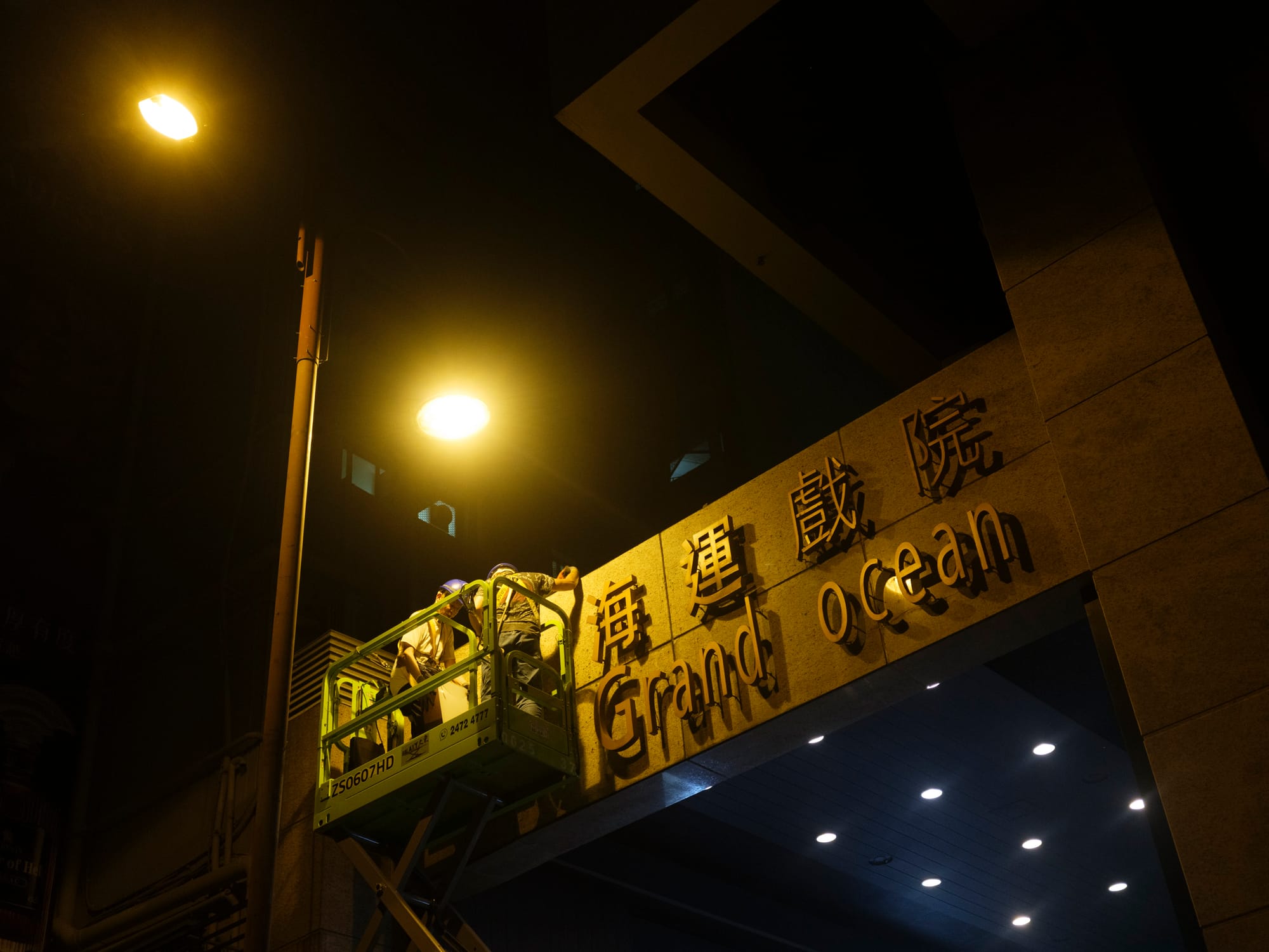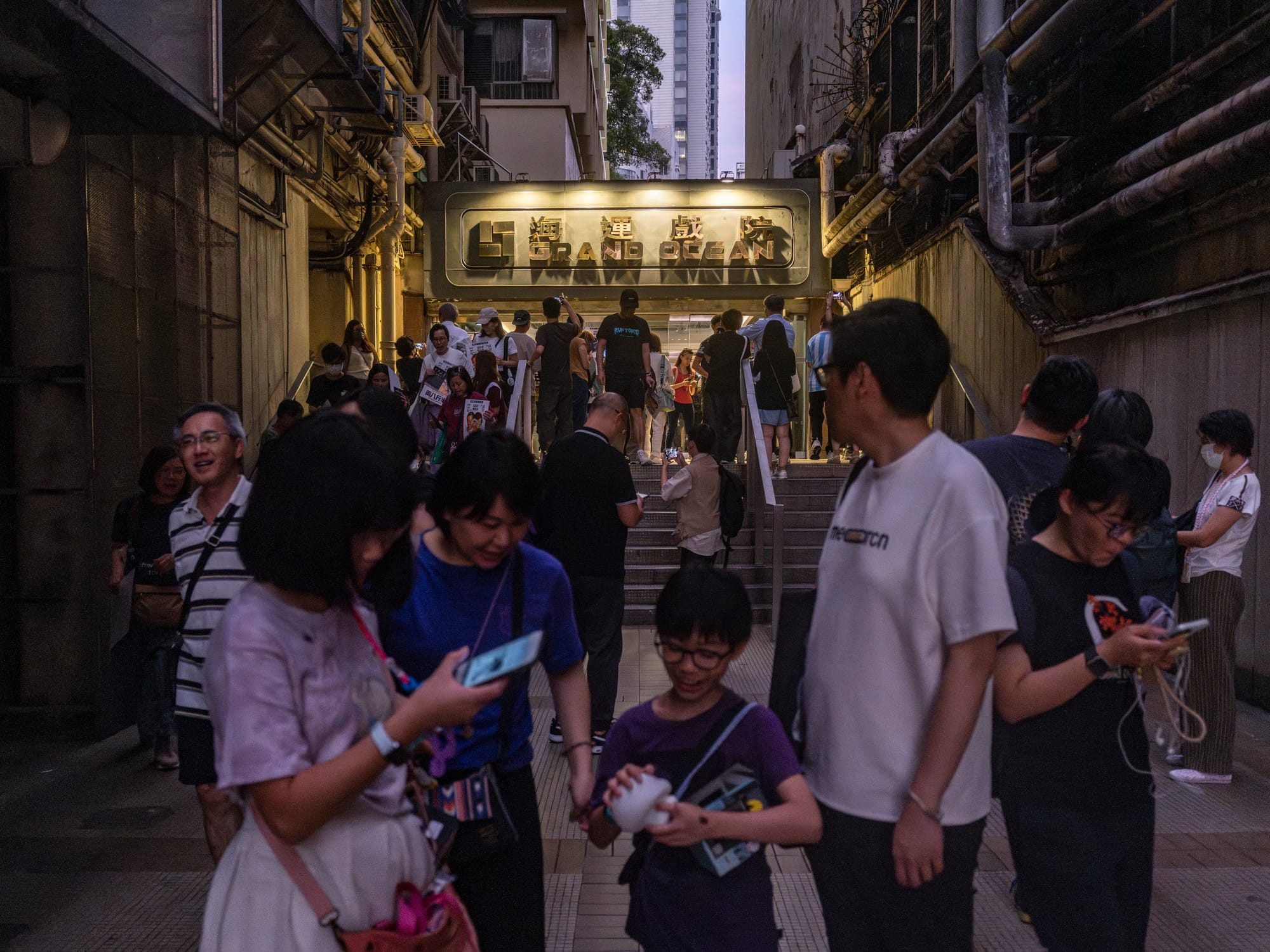 2025年6月1日,屹立尖東56年、嘉禾戲院旗下最有代表性的海運戲院正式熄燈,並在午夜拆下懸掛在廣東道上逾半世紀的招牌。在那最後一夜,戲院特別上映昔日最賣座的三部電影:《半斤八兩》(1976)、《猛龍過江》(1972)、《唐山大兄》(1971),也在之前特別放映經典爛片《The Room》,不少新老影迷特意前來送別。2020年疫情至今,全港已累計逾20家電影院結業。攝:鄧家烜/端傳媒