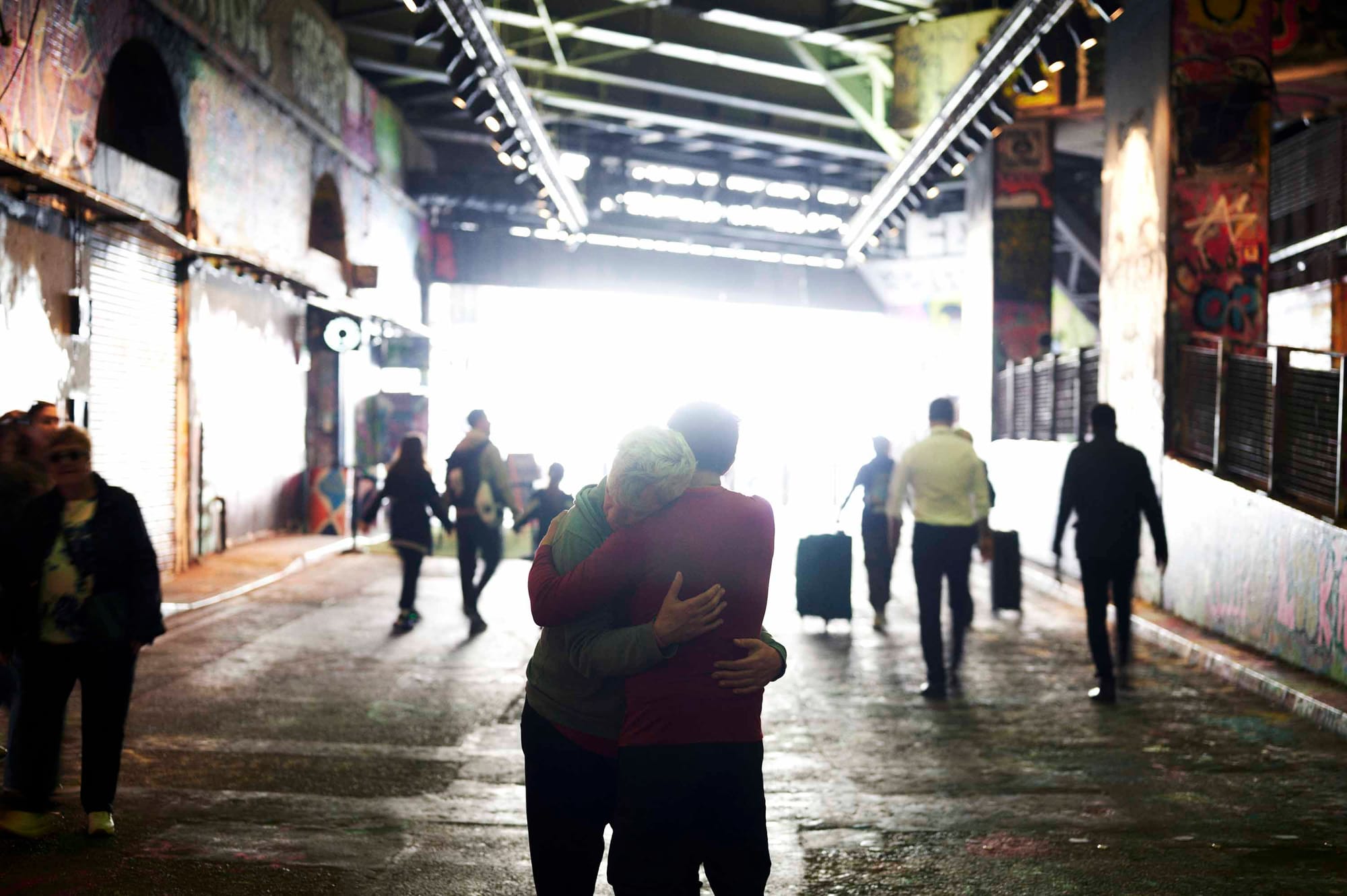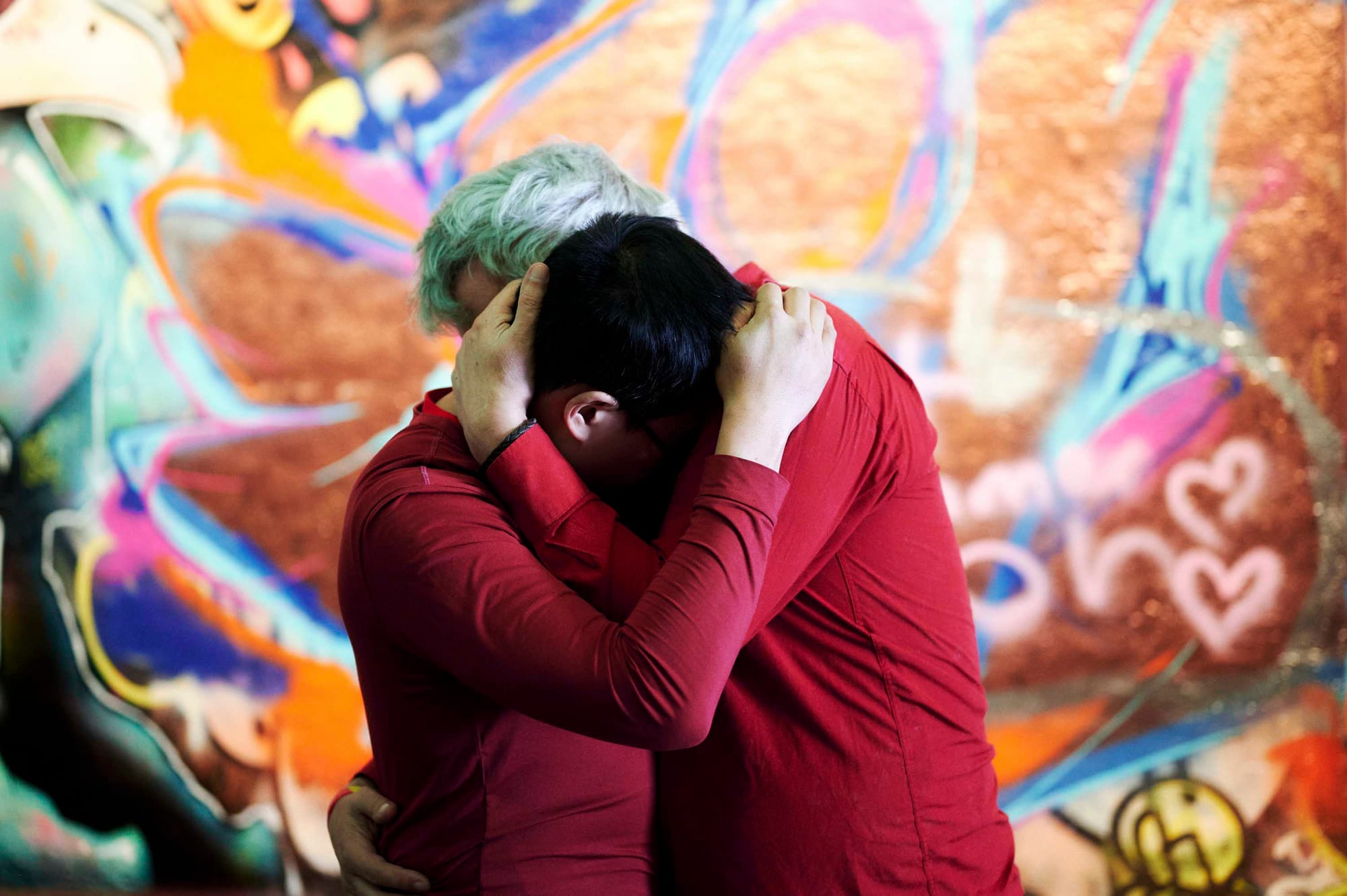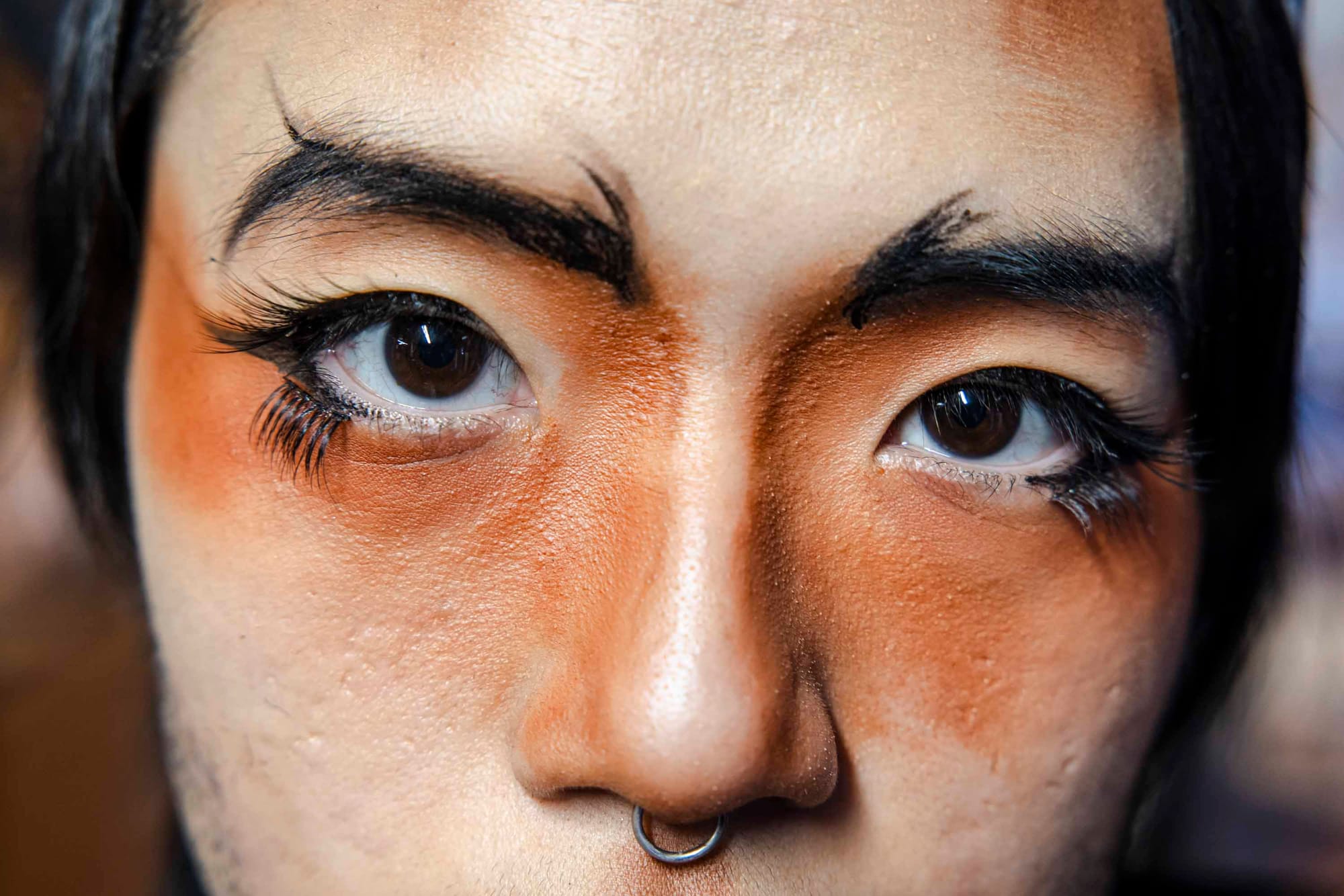 念慈的妝容靈感來自粵劇,喜歡畫上濃厚的橙紅色眼妝,畫粗眉和貼上假鬍碴,製造社會規範下的男性形象、八年前來英國的 Adrian 成立性小眾友善的羽毛球會「BJMF Badminton」、Felix與男友到了倫敦滑鐵盧車站附近的利克街隧道緊緊擁抱。攝:謝晞朗、Peter Wong/端傳媒