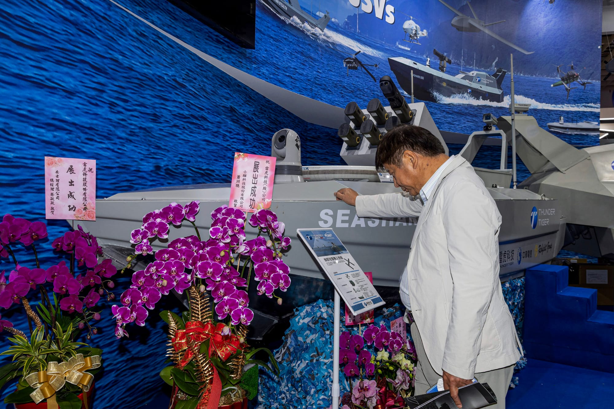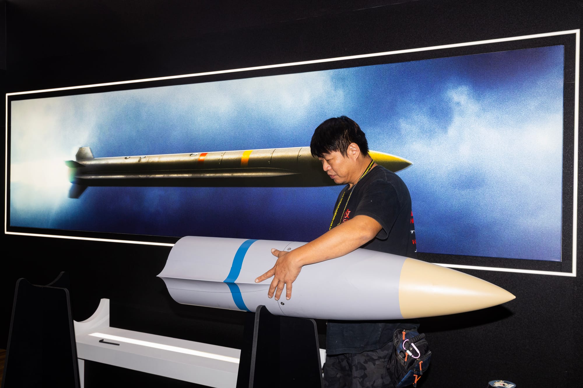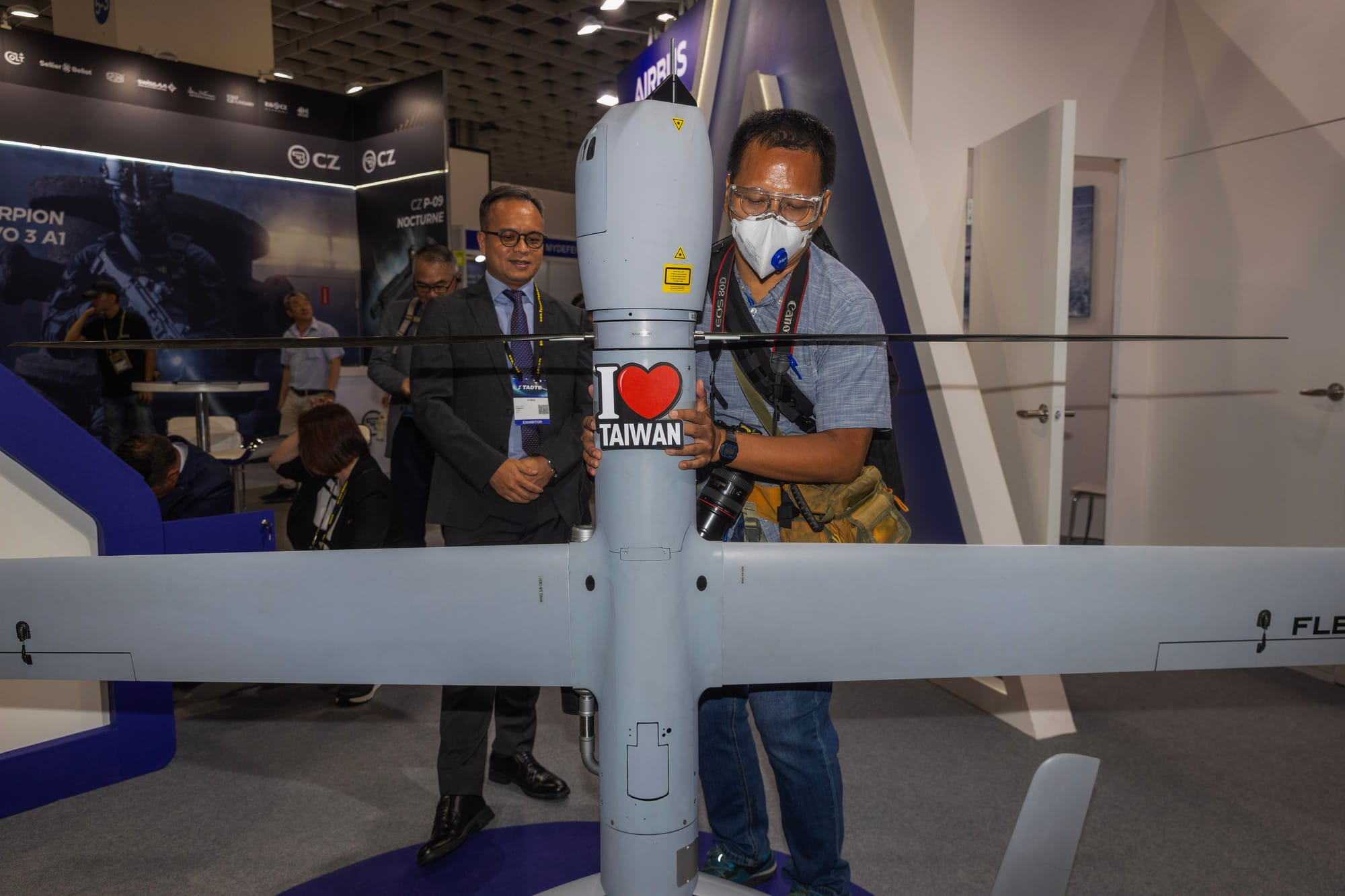 2025年9月18日至20日,南港展覽館,台北國際航太暨國防工業展,匯聚來自 14 國、超過 400 家廠商參與,本年主題為「先進國防、永續飛行、韌性供應鏈、無人未來」,規模為歷年來最大。展場除了最新的戰車、火箭系統、飛彈外,也有許多不同型號的無人機及無人艇等相關軍事設備,讓觀眾看到未來戰場和民用科技的發展,吸引軍事迷參觀,不少家長帶同小孩看展,參與現場攤位活動。2025年9月20日下午,展館外,台灣巴勒斯坦自由連線發起抗議,並公布研究報告,指出部分國際與台灣企業可能涉入以色列相關軍工產業,呼籲企業檢視供應鏈,避免淪為戰爭共犯。攝:陳焯煇/端傳媒