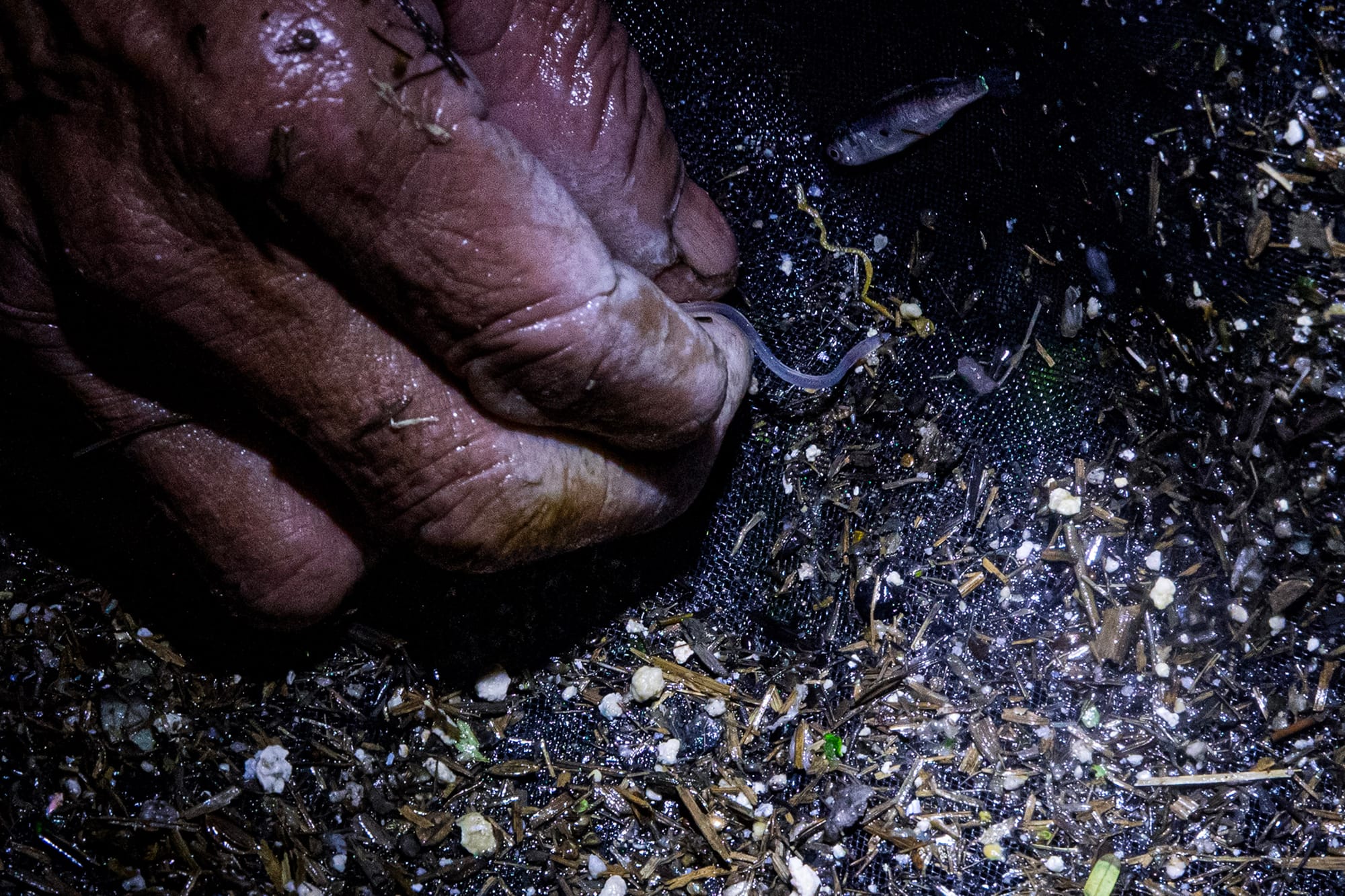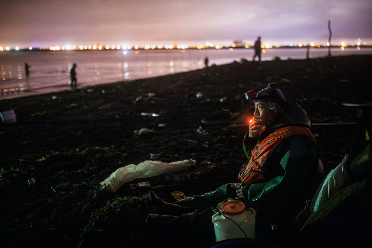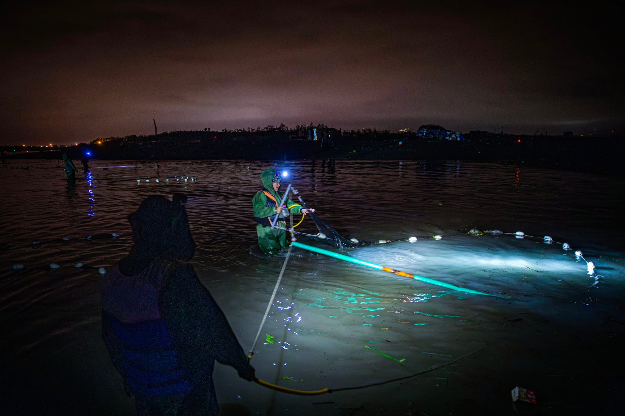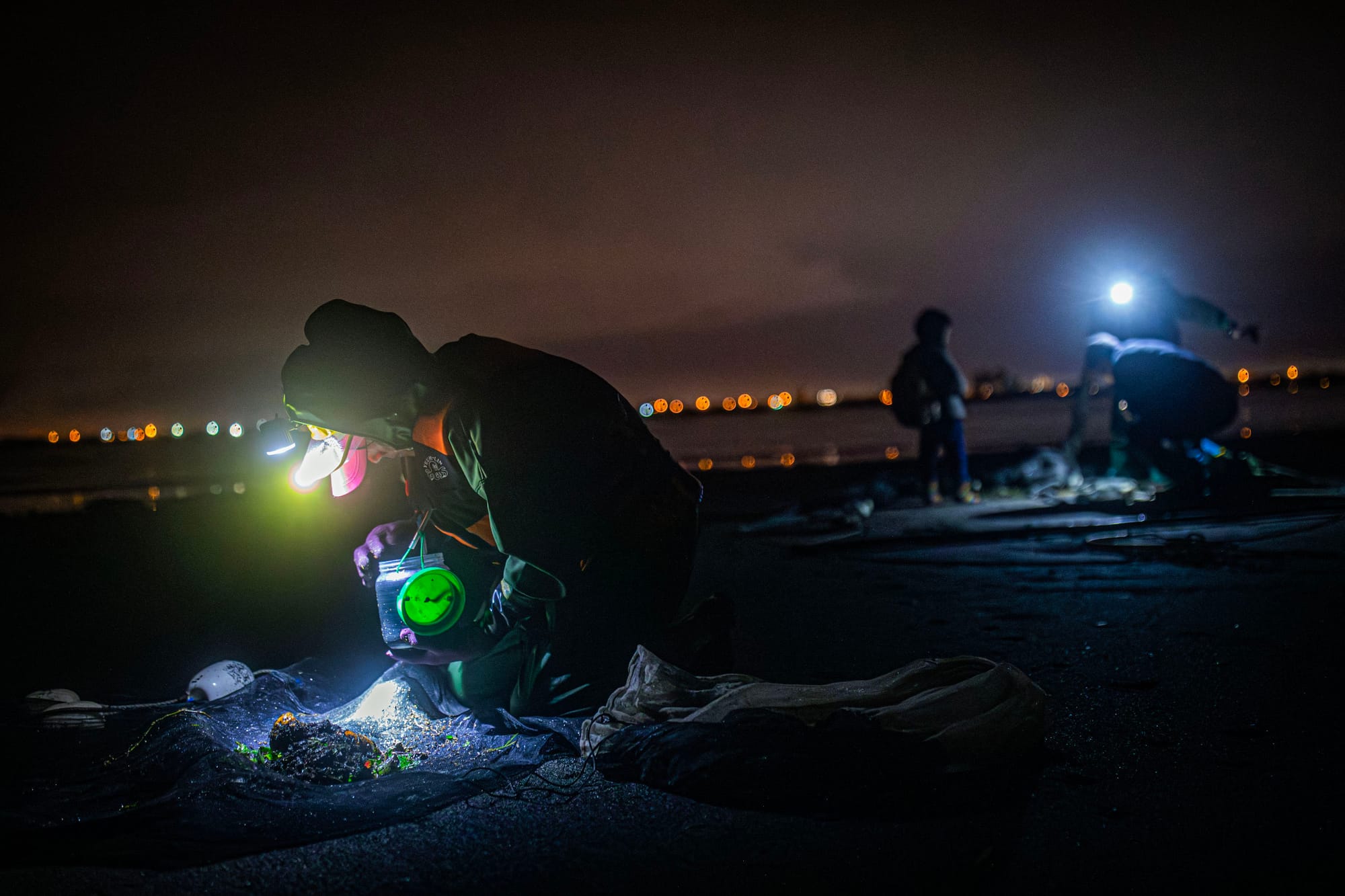 2025年2月19日,一群捕鰻人在宜蘭海邊捕鰻苗。攝:陳焯煇/端傳媒