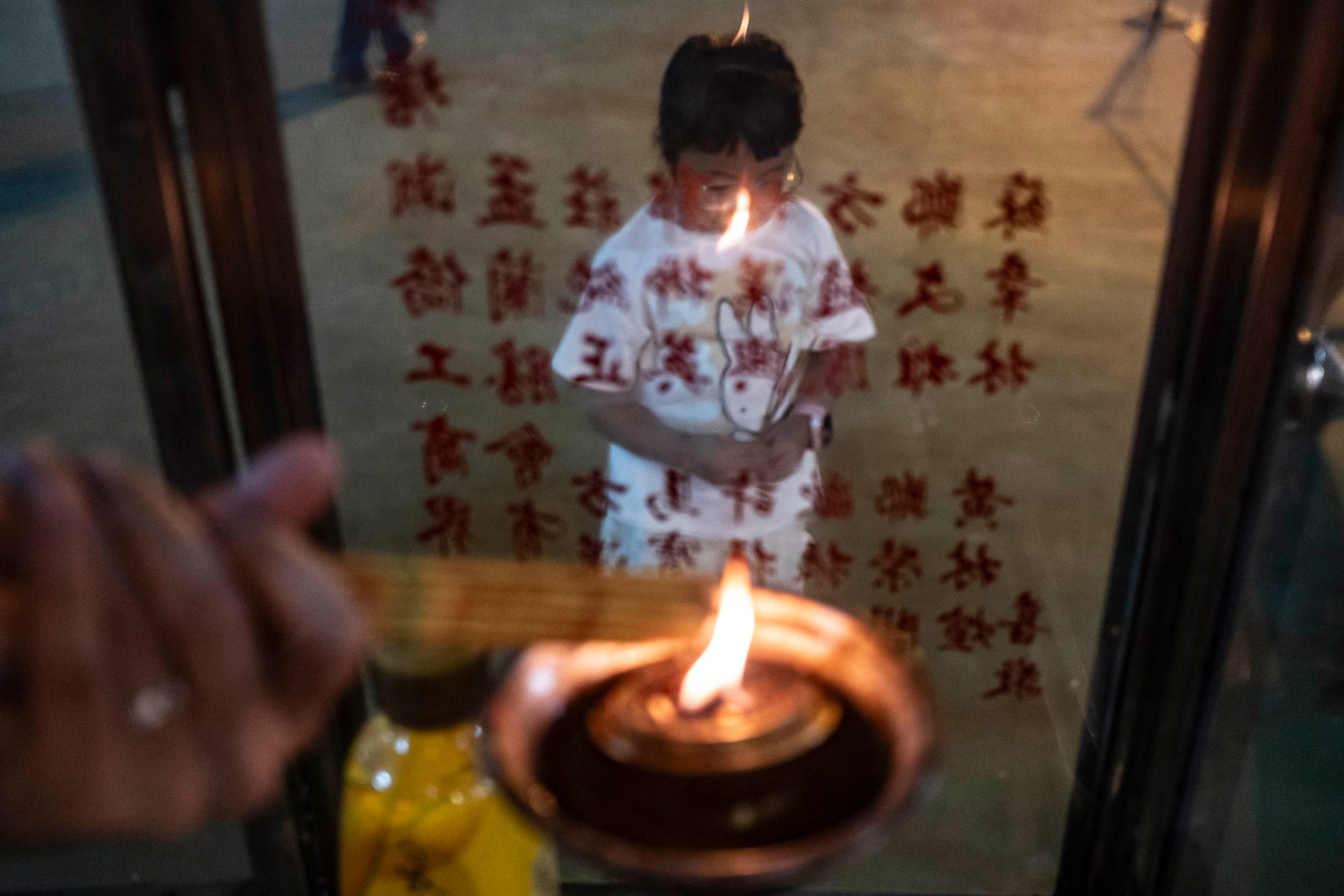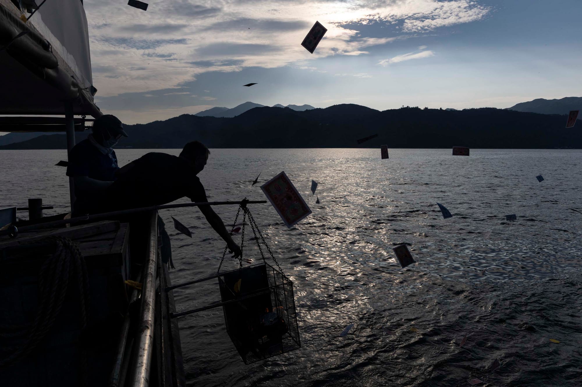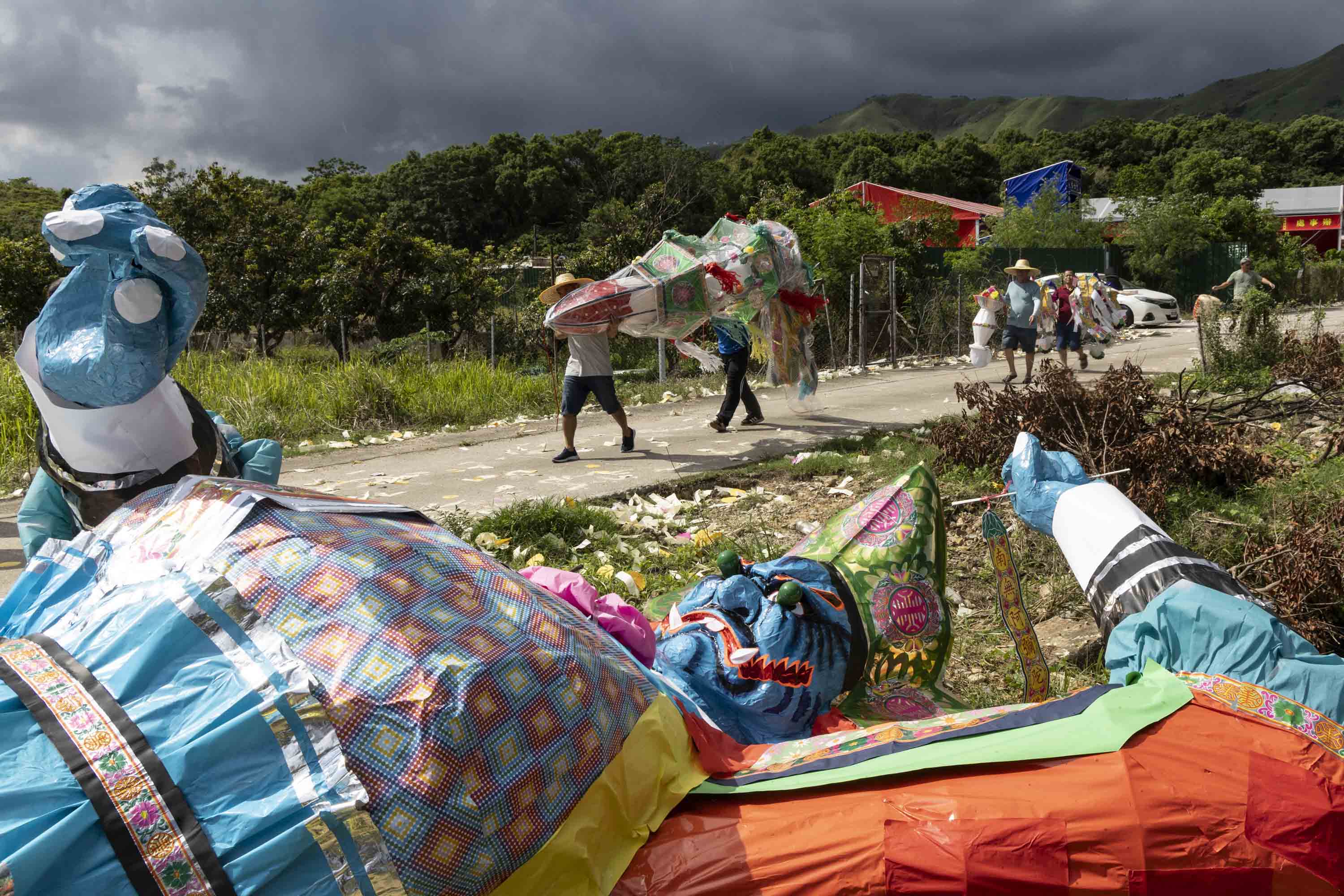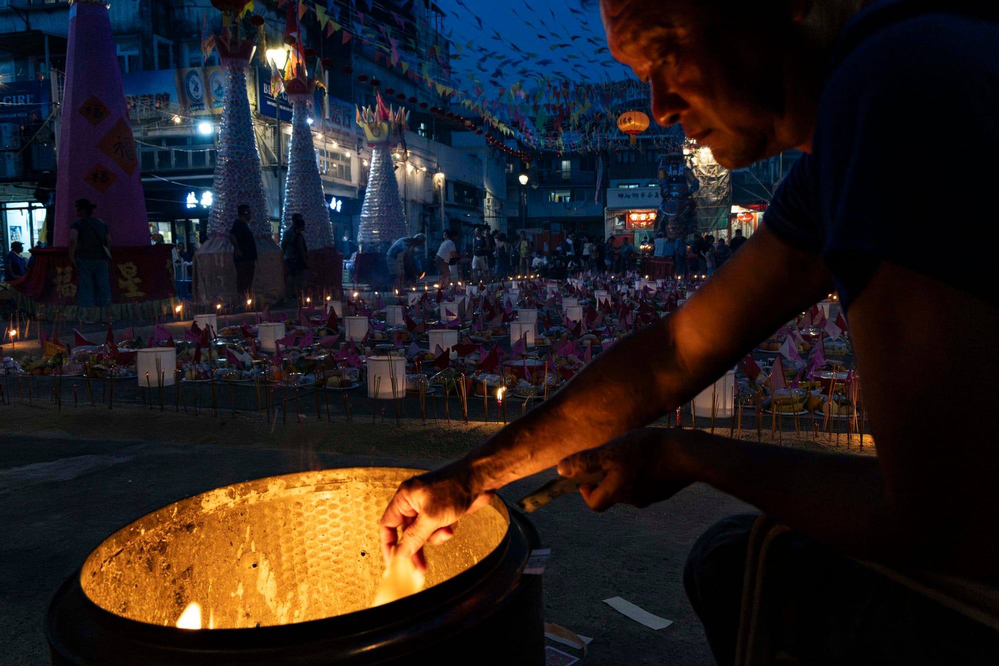 香港每年農曆七月初一,鬼門關開,陰間之門敞開三十日,傳說眾鬼得以短暫逗留人間,接受供奉,直到農曆七月三十一鬼門再度關閉,方才結束這段陰陽交錯的時節。在這期間,人們不僅會祭祀自家先人,也會為漫山遍野的無主孤魂舉行各式儀式,施以供品和法事,祈求它們得以安息。攝:鄧家烜/端傳媒