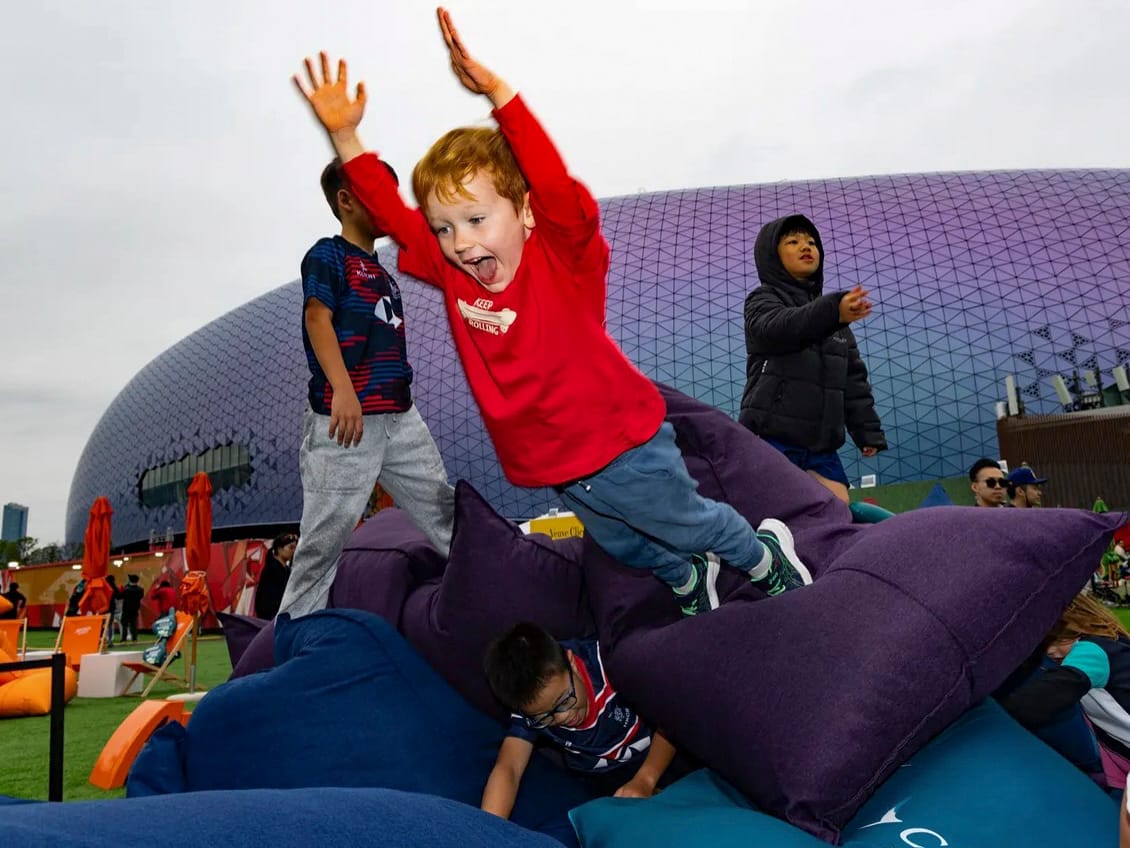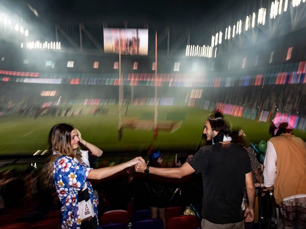 斥資319億元、興建6年的啟德體育園今年3月正式開幕,成為香港表演及運動場館的新地標。旗艦級盛事國際七人欖球賽6月亦首度移師園內舉行, 一連三日賽事創下約11萬人入場的歷史新高,南看台扮鬼扮馬的傳統依舊,場內鬼佬飲酒跳舞熱情狂歡。攝:鄧家烜/端傳媒