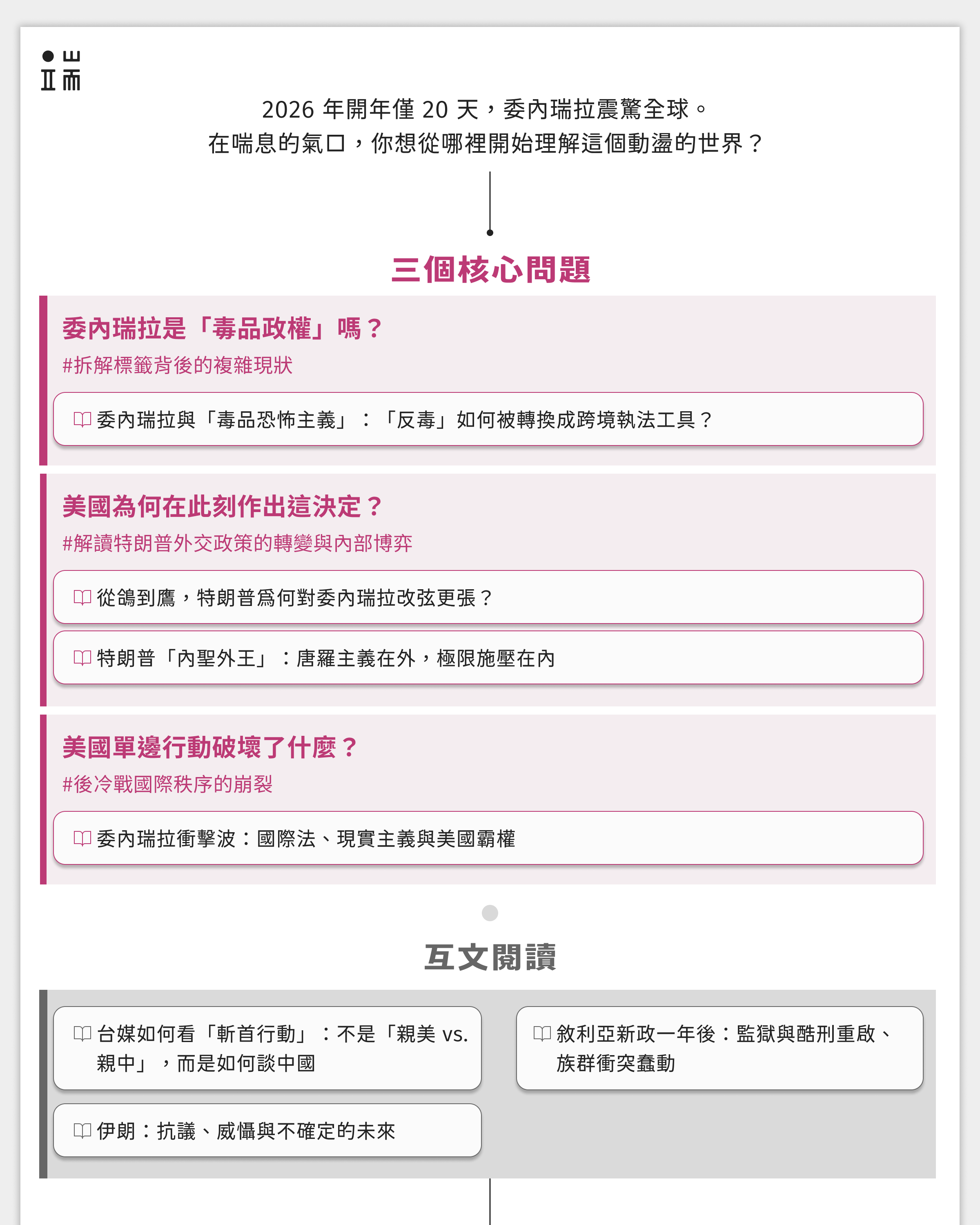 回到年初,在新聞突發瞬間,我所看到的關於委內瑞拉的第一篇「答案之書」,是由委內瑞拉學者發表在 Security Context 上的一篇文章,後經我們翻譯成《委內瑞拉聲音:在美國干預與政治未來中,我們正處在十字路口》。這篇文揭示委國輿論、政治的複雜,並提醒局外人可能會迅速看到一個事實: