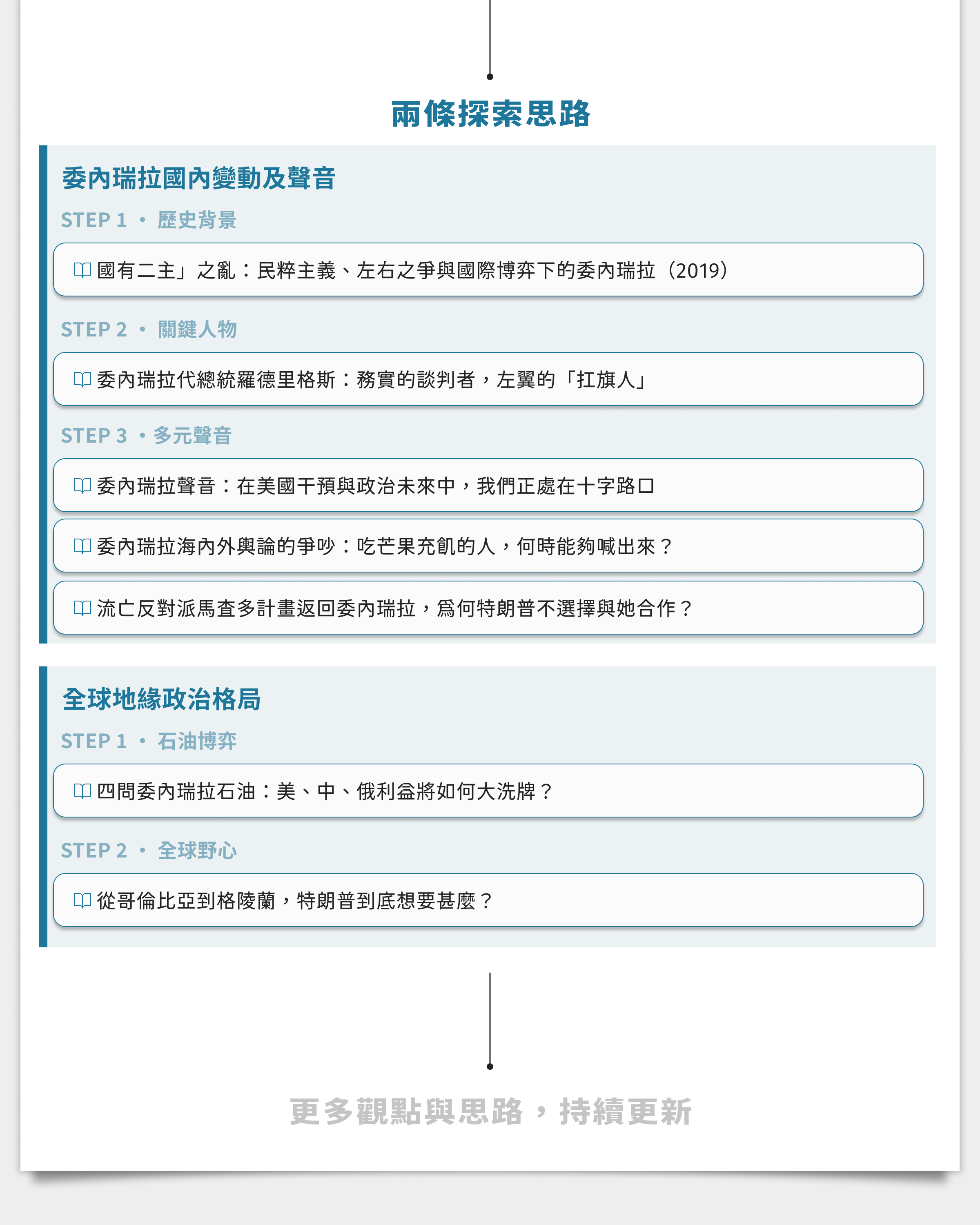 與此同時,專題必須很快地開出兩條思路:1、委內瑞拉國內變動及聲音;2、以爭奪資源為特徵的全球地緣政治格局,以及美、中、俄在當地的存在。