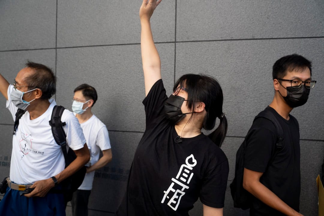 开审首日不少市民在法庭外排队旁听,在队伍排首位的前支联会常委邓岳君,接受现场传媒采访时,被警方阻止展示写有「1989」、画有「民主女神像」纸张的折凳,理由是会影响其他在场人士。