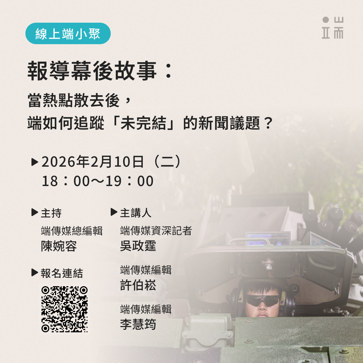 如果你也好奇,一則深度報導如何在熱度之外繼續發展,歡迎來到這場關於追問與堅持的端小聚。