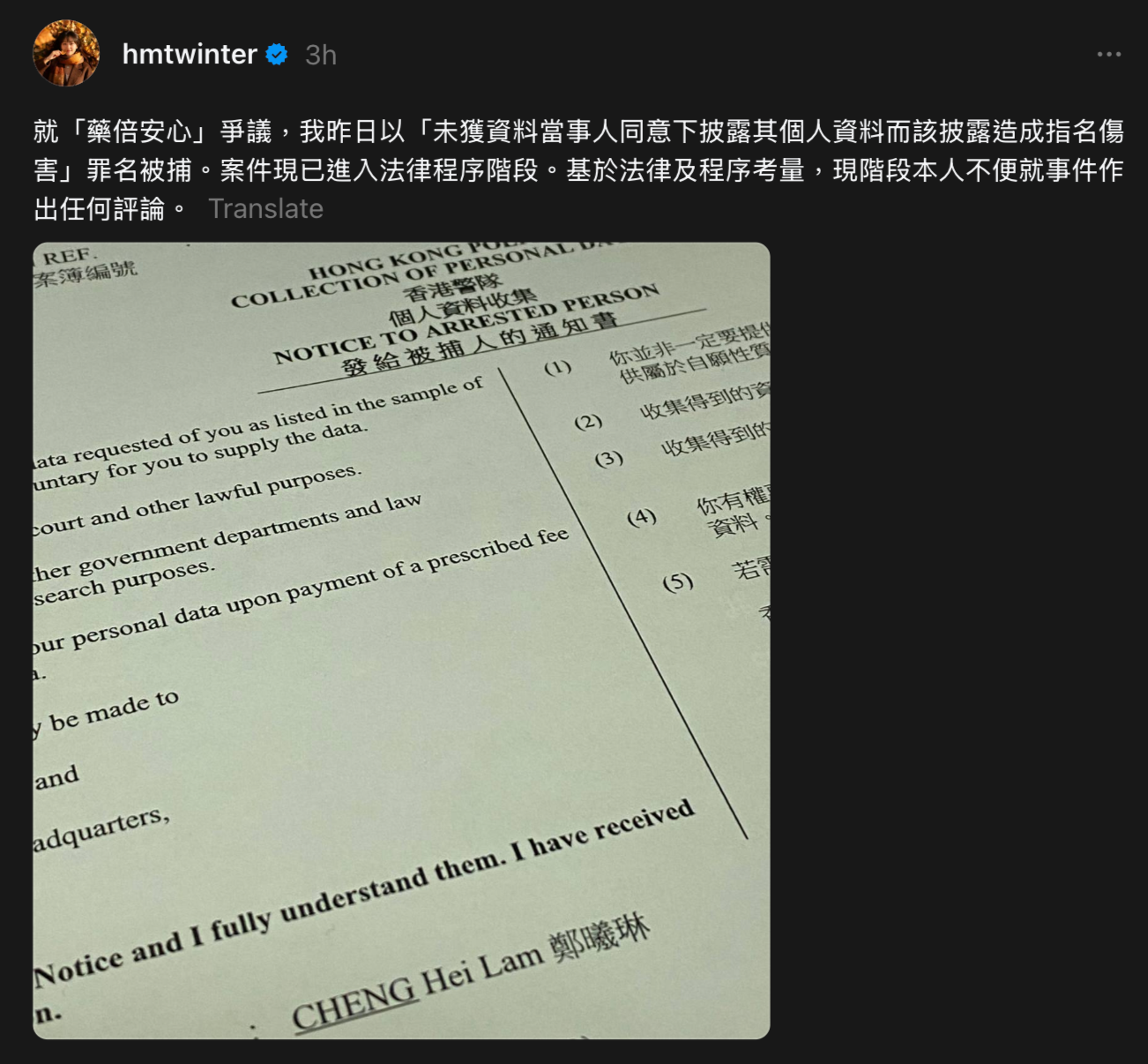 鄭曦琳6日在個人社群帳號發文稱,案件現已進入法律程序階段,現階段不便就事件作出任何評論。她同時張貼出一份香港警隊發給被捕人的通知書,可以清楚看到她的中、英文全名,除此之外無其他資訊。
