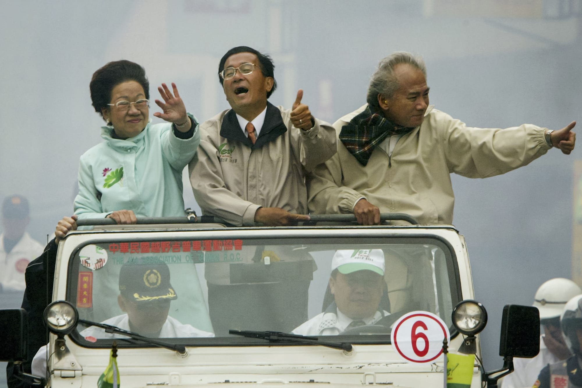 2004年3月18日,台北,总统大选期间,台湾总统陈水扁(中)和前民进党主席林义雄(右)一同向支持者挥手致意。摄:Paula Bronstein/Getty Images