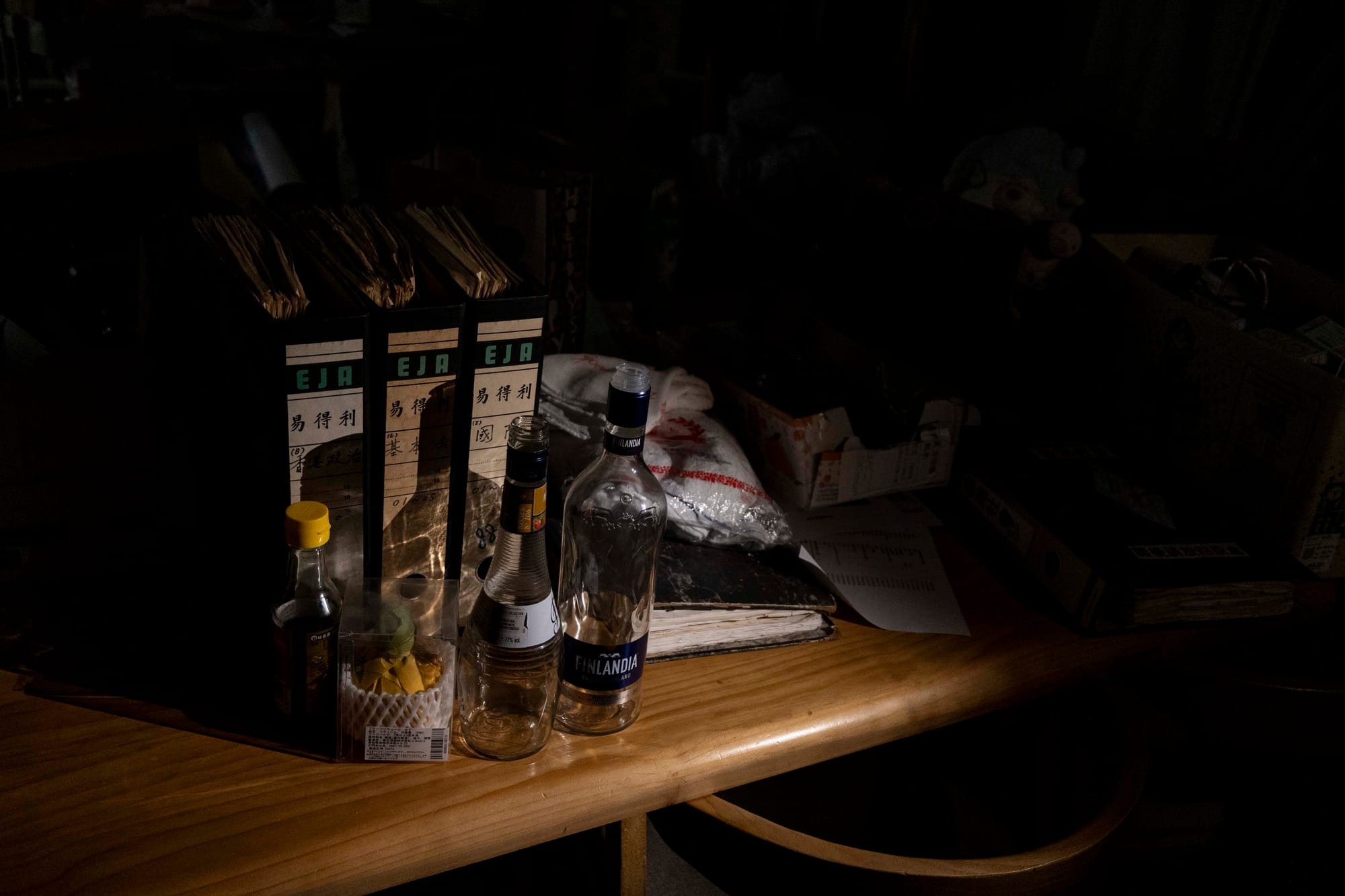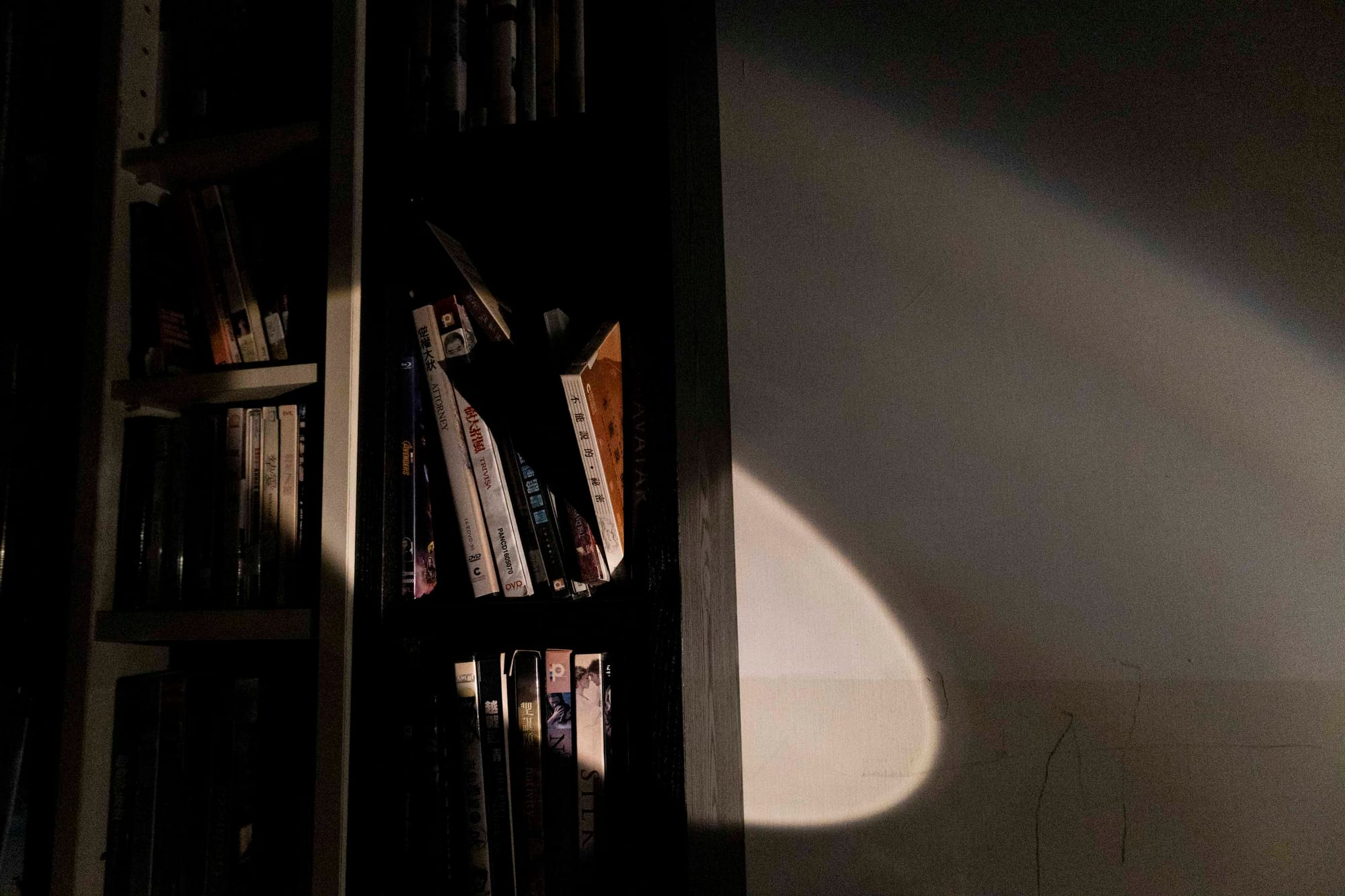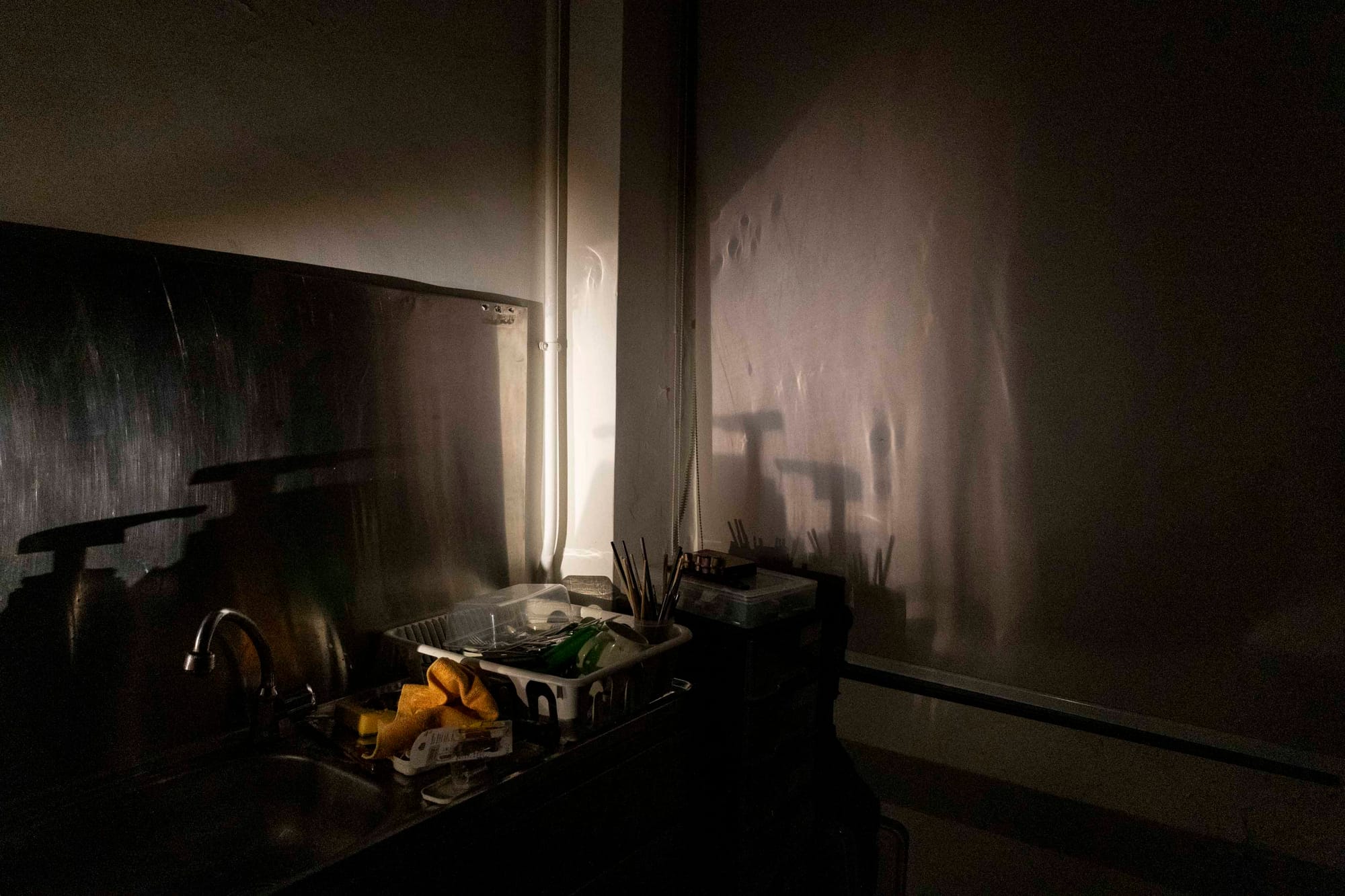下午兩點的聯合書院學生會原址,微弱的陽光滲入會室,穿過小丑裝飾,落在爵士鼓上,讓原本死寂的會室瞬間變美。偶爾沒有自然光,唯有依靠會室內的物品做光源:用雪櫃的光管,折射的光碟,扳彎螢光棒,電腦屏幕及酒瓶打出粼粼波光。我不純熟地打燈,盡可能打出想像中的光線。
