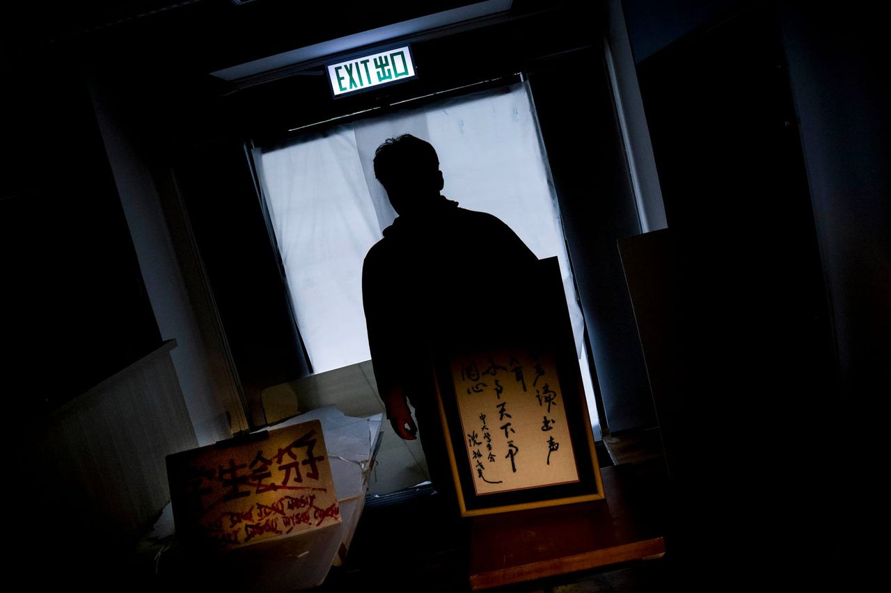 不規則的光照在人臉上,灑在文件上,映在學生會旗幟上。