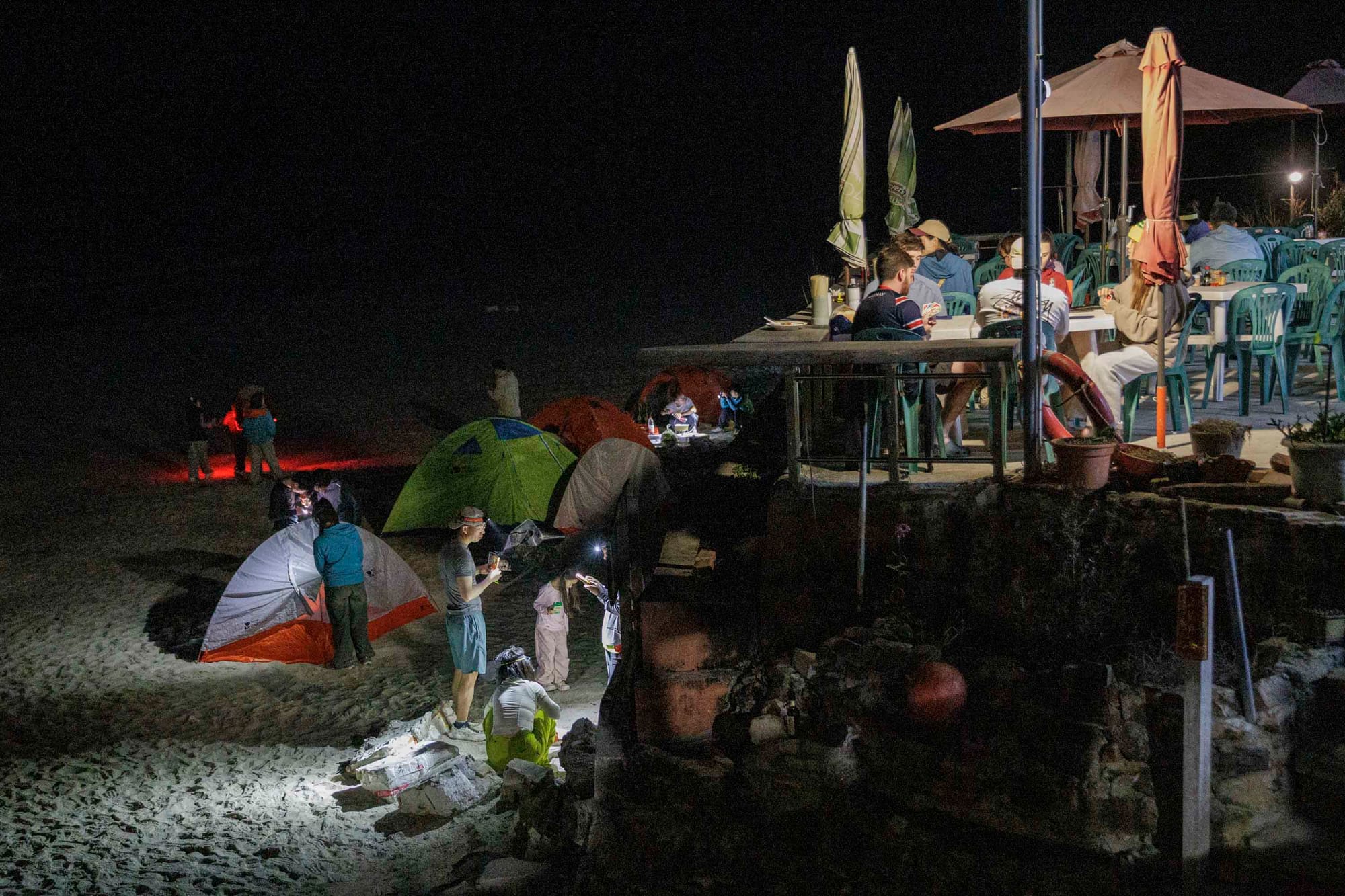 端傳媒攝影記者初一及初四兩度前往現場留宿過夜觀察,看見入夜後的鹹田灣沙灘滿佈露營帳篷,遊人在沙灘上非法生火。按記者所見,儘管署方在廁所外貼有繁簡英三語告示,惟「咸田公廁」外的洗手盆被泥沙堵塞,地面滿佈泥沙。清潔工手持膠水喉在旁等待清潔,惟清潔過後,洗手盆旋即再被旅客佔用刷牙、清洗廚具。