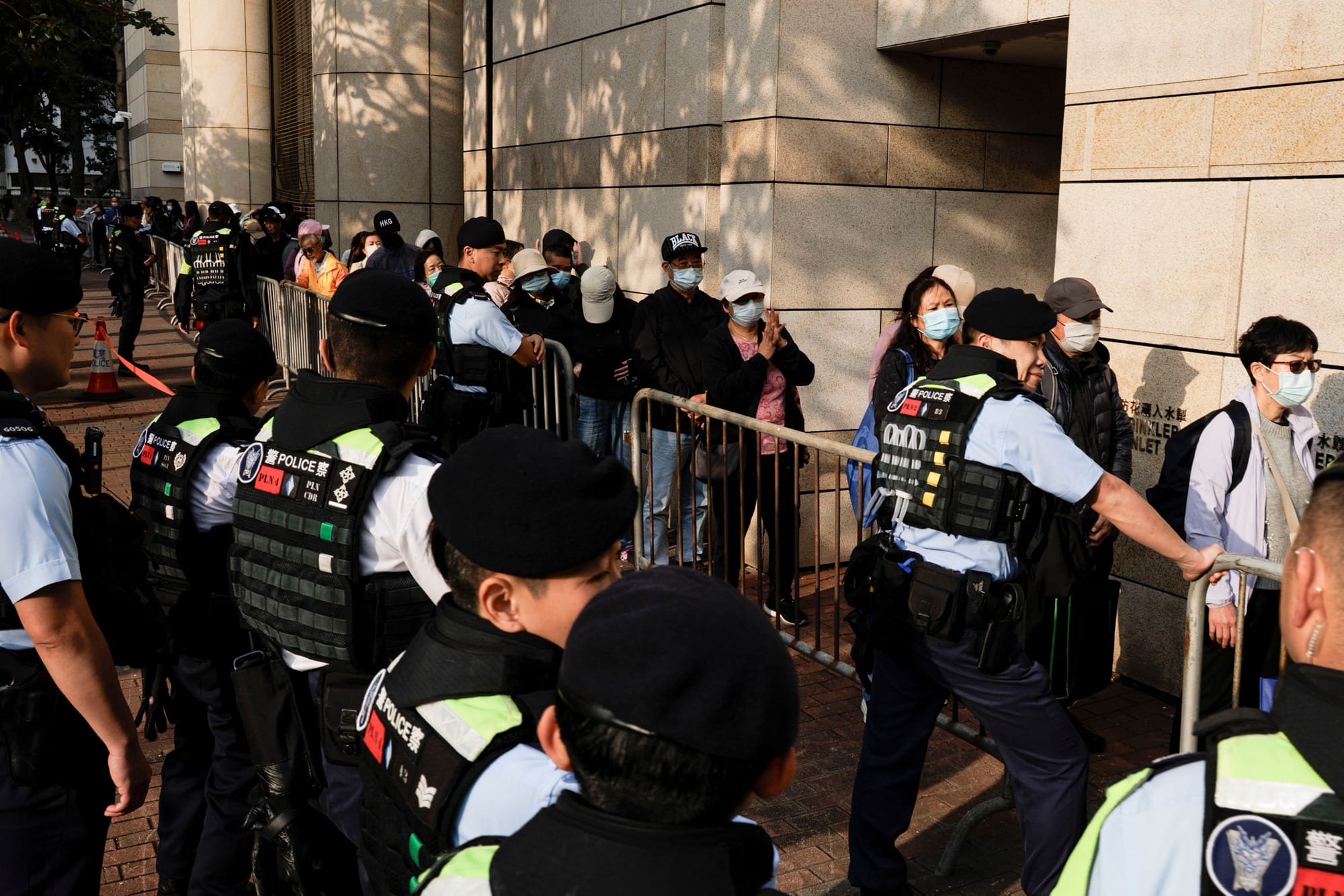 較早在庭外,2月初,警察在黎智英案安排旁聽人士等候排隊時,出入必須實名登記,此外又以橙帶和鐵馬隔開旁聽輪候隊伍,47人案上訴庭裁決亦開始使用相關安排。早前,傳媒仍能在橙帶外巴士站採訪,但2月初蘋果案開始被警方限制,市民接受訪問必須登記離開隊伍,在路上訪問;今天,記者則被要求改至法庭正門外的劃定記者區採訪,一度有記者與警方理論。