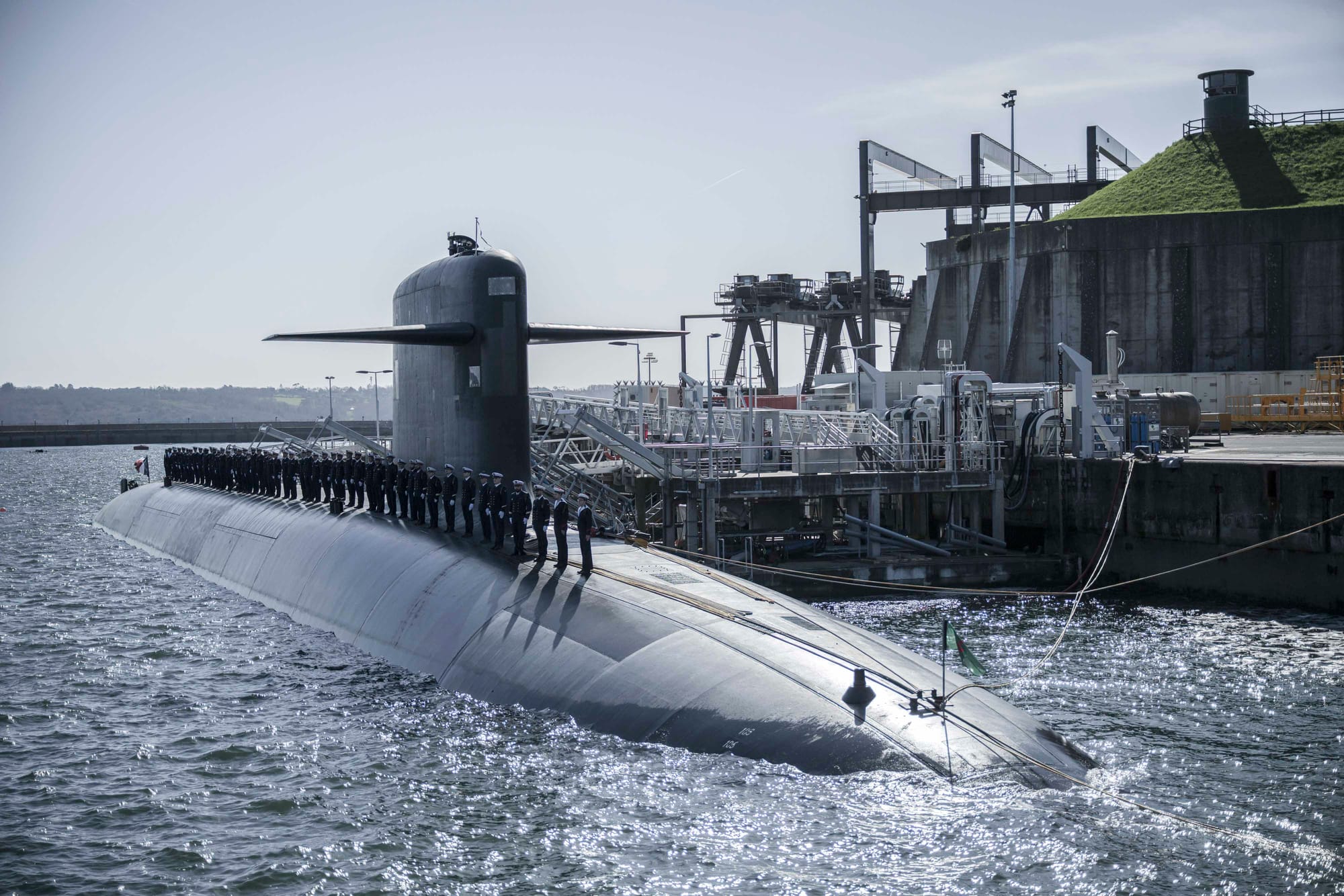 这座基地是法国海基核威慑力量的核心枢纽,现役「凯旋级」战略核潜艇在此完成出航前后的维护与整备。发言现场特意安排在一艘潜艇巨大的黑色艇体前,象征意味明显:法国核战略的任何调整,都以其最核心的威慑力量为背景。