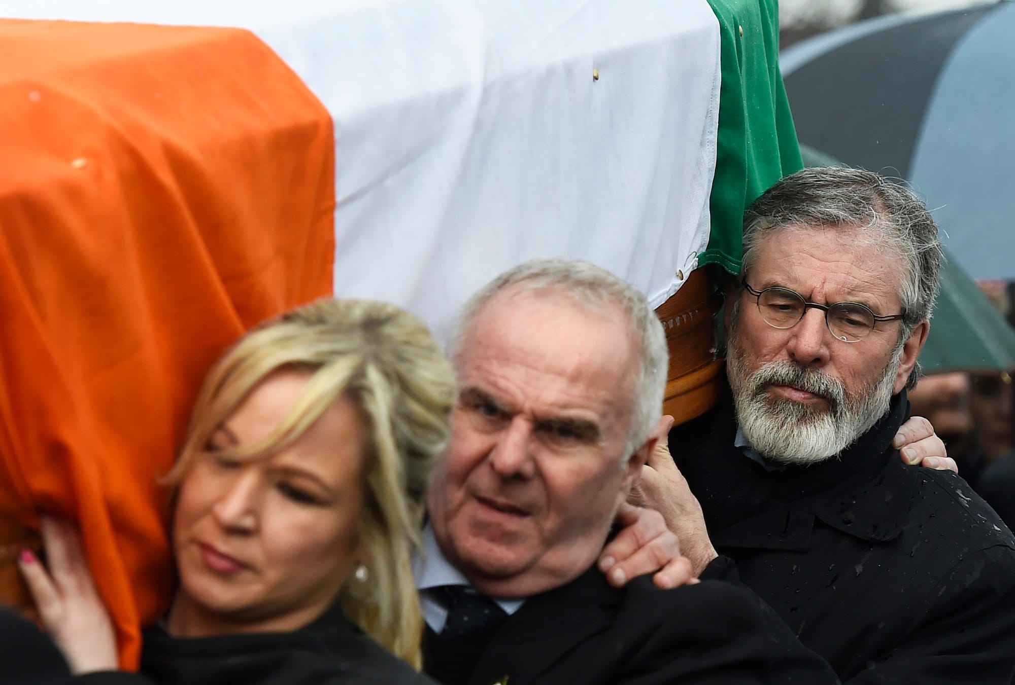 原告方律师在法庭展示1971年的一张照片,照片中亚当斯正为凯恩(Michael Kane)抬棺。凯恩是一名IRA志愿兵,在贝尔法斯特一场爆炸事故中丧生。奥多尔蒂形容亚当斯当时俨然是「最高领导人」,并补充说:「在IRA荣誉守灵葬礼中,通常只有他(死者)在IRA内最亲密的战友,才会为其执行送别荣誉。」