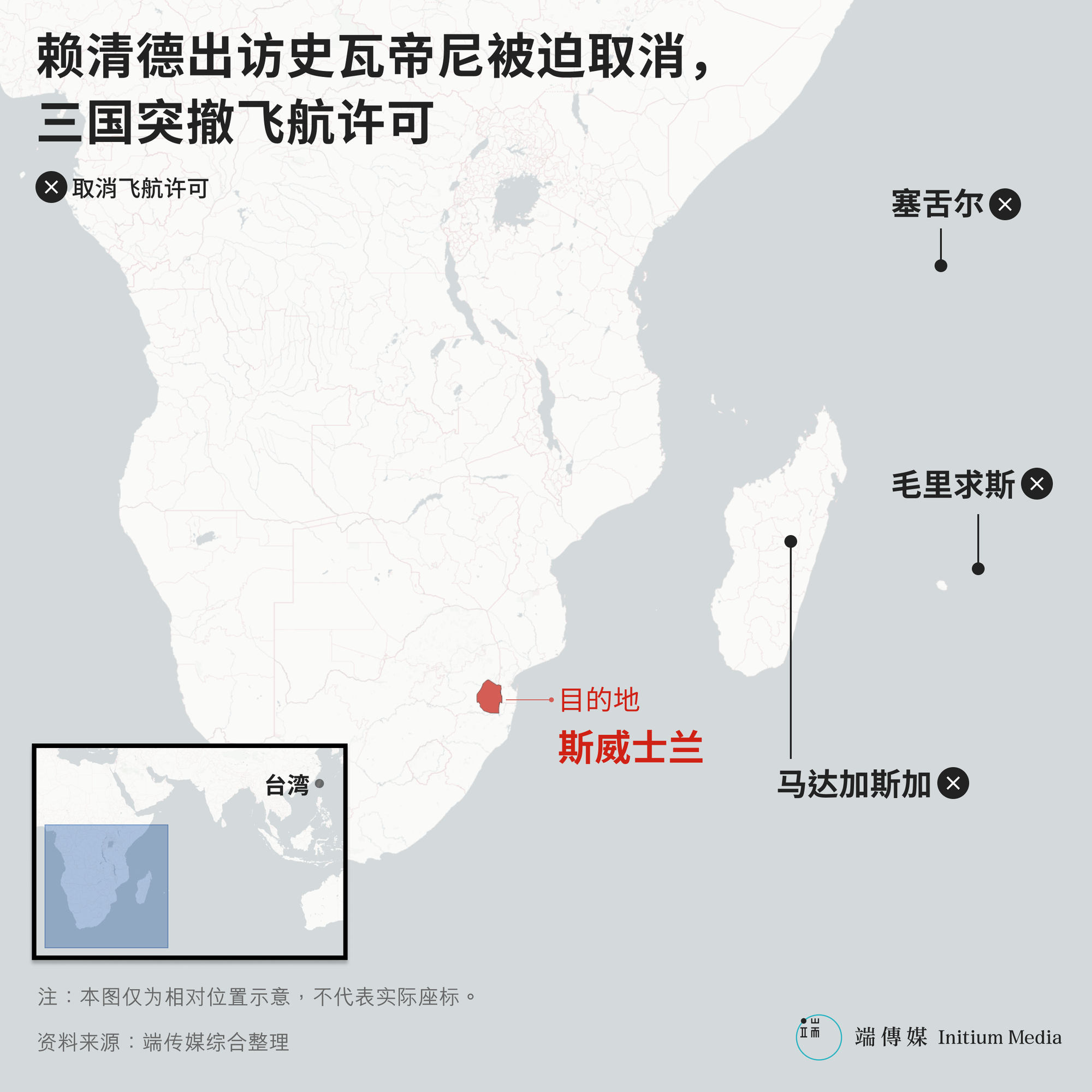 台湾总统赖清德原订于4月22日出访非洲唯一邦交国史瓦帝尼王国(Eswatini,斯威士兰),21日傍晚却在启程前数小时召开紧急记者会,临时喊停。总统府秘书长潘孟安表示,专机航程途经的塞席尔(Seychelles,塞舌尔)、模里西斯(Mauritius,毛里裘斯)、马达加斯加(Madagascar)三国临时取消飞航许可,考量元首、访团及飞航安全,决定暂缓出访行程,并另行指派特使出席史瓦帝尼的「双庆」国家庆典。