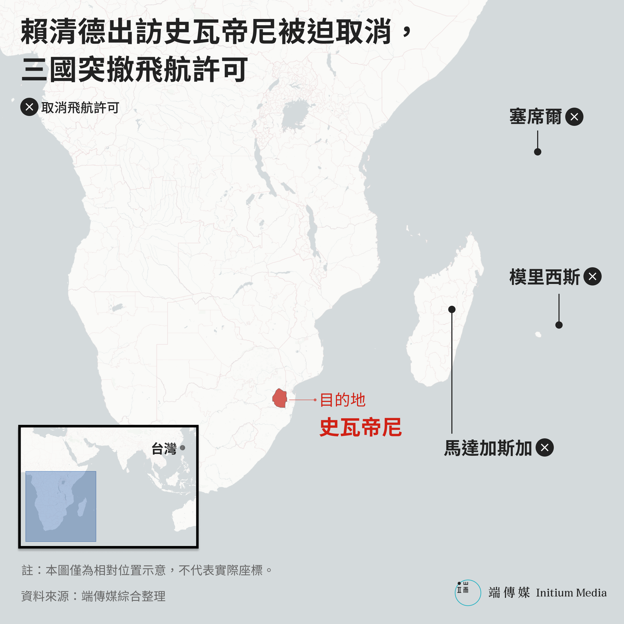 台灣總統賴清德原訂於4月22日出訪非洲唯一邦交國史瓦帝尼王國(Eswatini,斯威士蘭),21日傍晚卻在啟程前數小時召開緊急記者會,臨時喊停。總統府秘書長潘孟安表示,專機航程途經的塞席爾(Seychelles,塞舌爾)、模里西斯(Mauritius,毛里裘斯)、馬達加斯加(Madagascar)三國臨時取消飛航許可,考量元首、訪團及飛航安全,決定暫緩出訪行程,並另行指派特使出席史瓦帝尼的「雙慶」國家慶典。