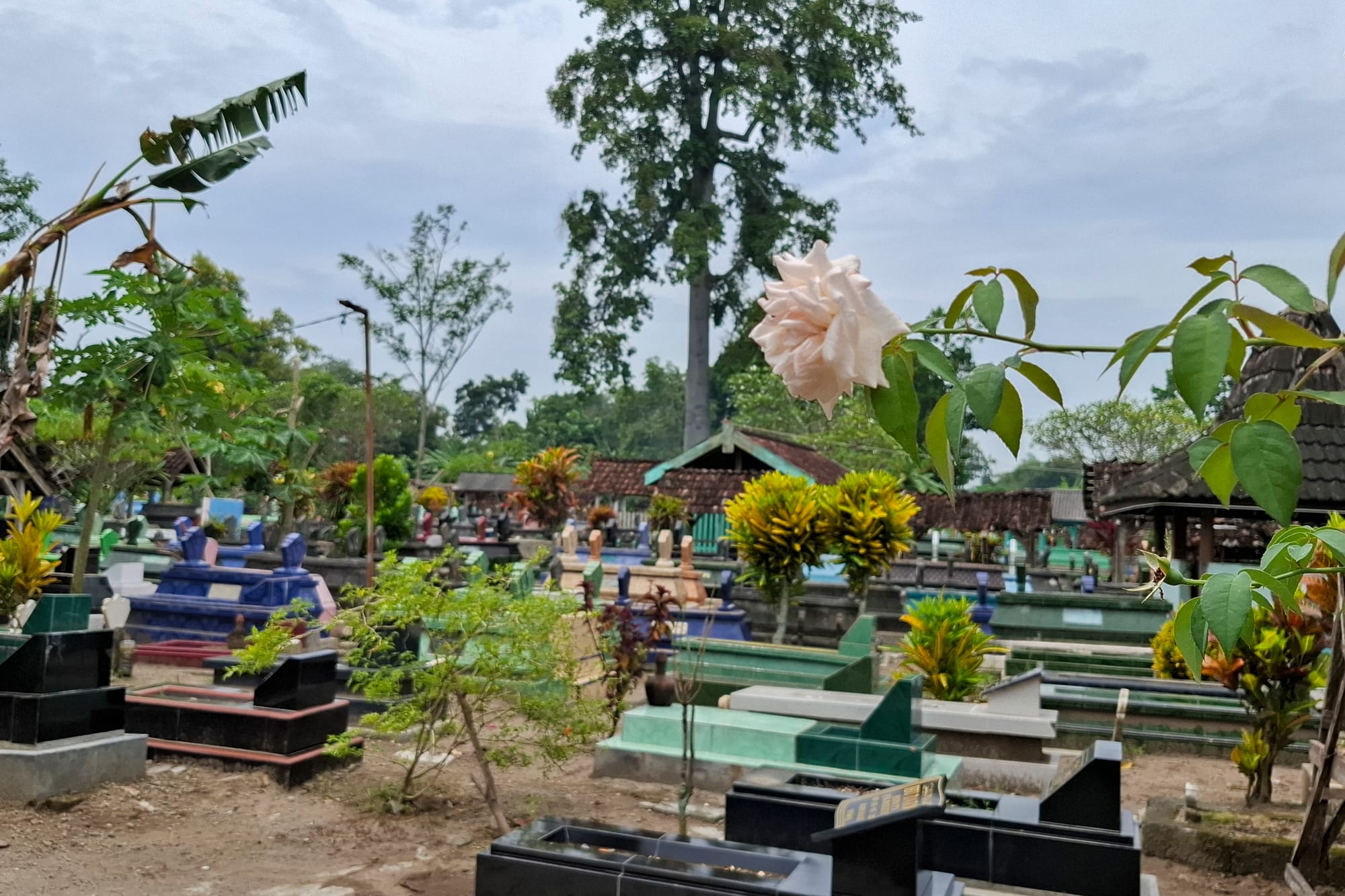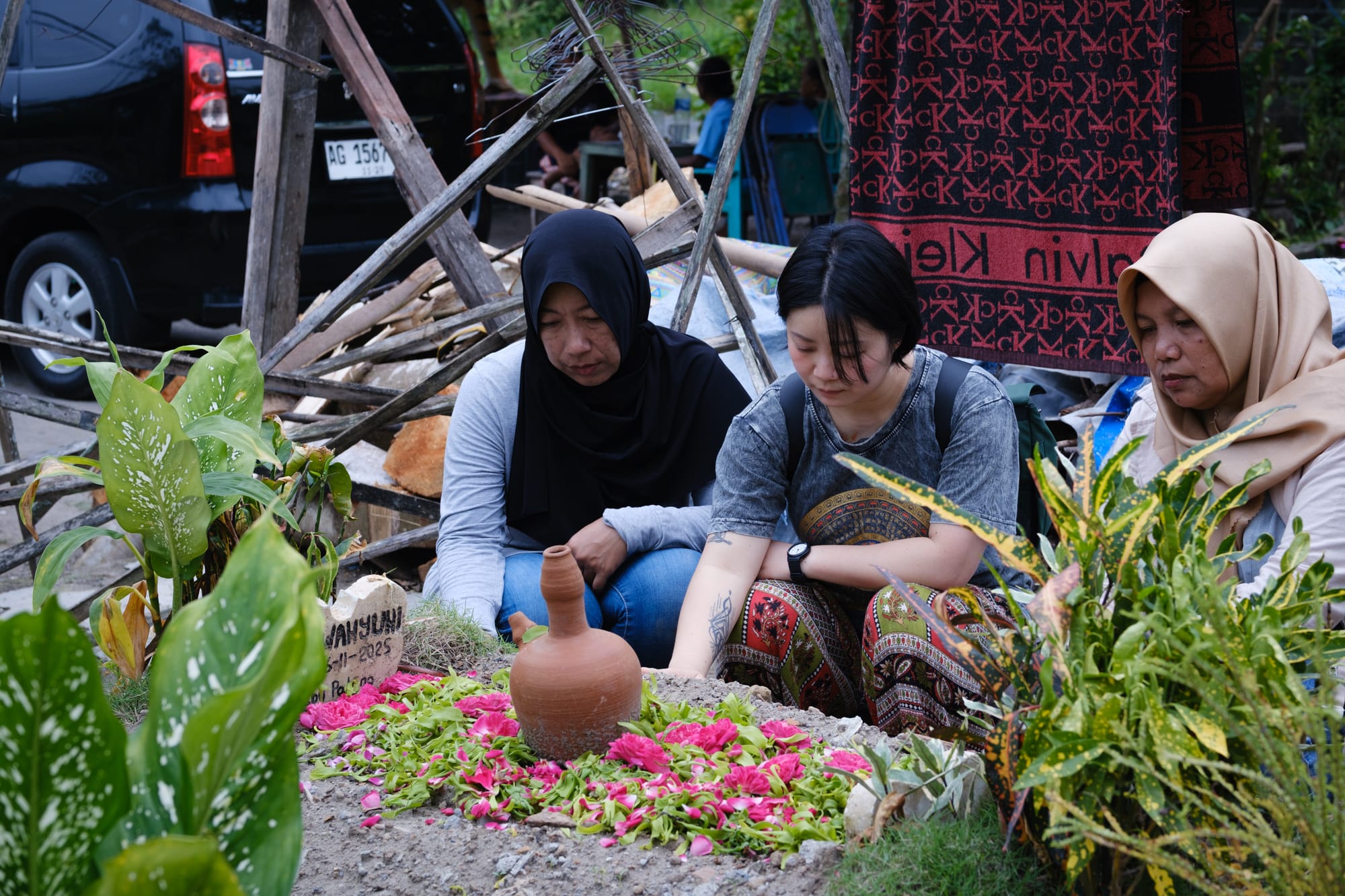 每到一處家訪,謝欣然都會帶上鮮花到殉職者墓前拜祭。她覺得印尼的拜祭是一個很溫柔的儀式:大家把依蘭和玫瑰撒到墓上、再慢慢為墓地澆水,一切都是靜默而克制地進行。在過程中,逝者靈魂被淨化、超渡,對生者亦是一種排解和抒懷。