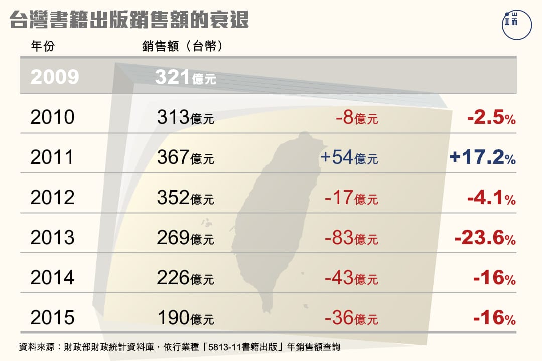 台灣的電子書產業,大約是在2008年隨著「十大重點服務業」發展綱領中的「數位內容」政策起步。在經濟部的政策補助與推動下,許多電子書店陸續成立,但可惜未能獲得讀者青睞。雜誌業者從月租型服務,如 PUBU 飽讀、Hami月租包等,還能獲得較高收入;但書籍零售數字則十分慘烈,直到現在電子書僅佔約各出版社銷售的1至3%,收入遠遠不如預期。