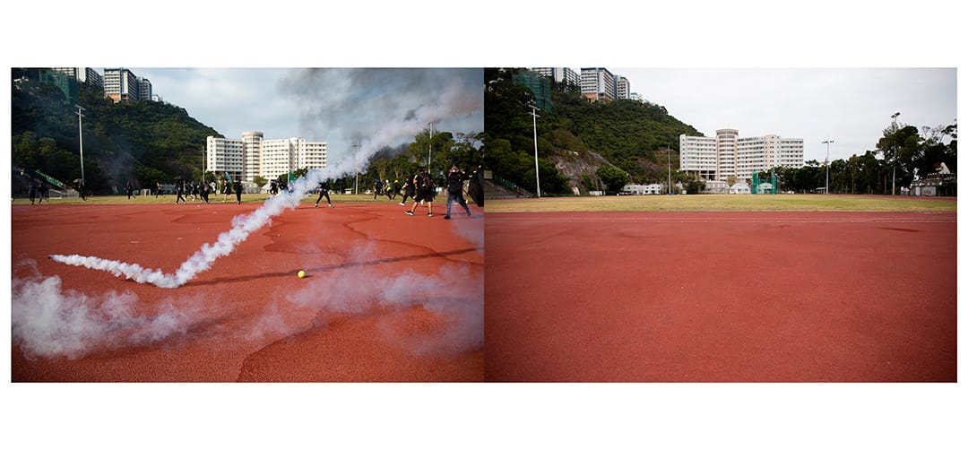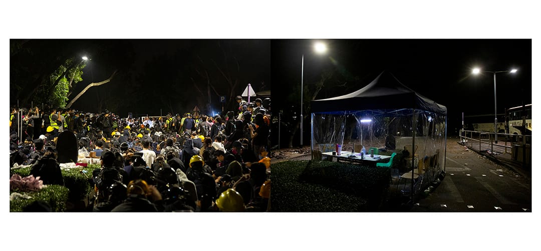 那個激烈的衝突晚上前的下午,警方進入了校園,拘捕了數人,抗爭者退守至迴旋處及運動場。我走進運動場,有一個同學激動地大叫:「阿婷/庭,你係邊呀!係邊呀!」周遭沒有回應,他開始聲淚俱下,旁邊的人上前安慰他。我沒有按下快門,這一幕卻一直縈繞在腦海裡。下一秒,幾枚催淚彈在頭上落下。
