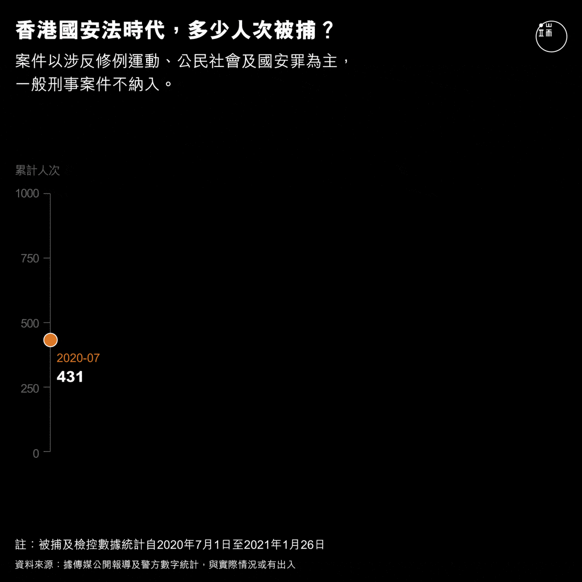 針對上述大量案件,端傳媒每日整理傳媒公開報導和警方數據,收集自2020年7月1日至2021年1月26日的每日拘捕、檢控數據,呈現國安法時代的大搜捕趨勢和特點。至今至少1136人次被捕,144人次被檢控,除國安罪外,大量拘捕也繼續以非法集結、刑事毀壞、暴動、協助罪犯進行,個別人士重複被捕、被檢控。