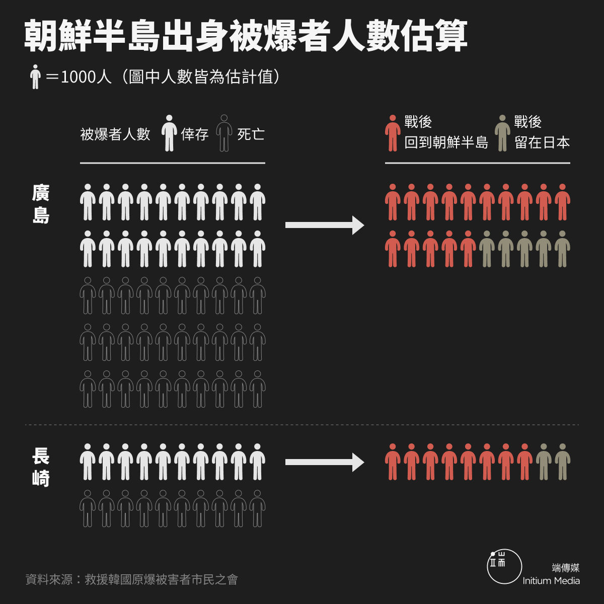 另根據韓國政府2010年出版的「廣島與長崎的朝鮮人核武受害調查」報告書,1930年在廣島的朝鮮半島出身者只有7,189人,但到了1945年就成長到8萬4,886人。在長崎的朝鮮半島出身者也從1930年的4,944人,到1945年成長到6萬1,773人。廣島和長崎在日本殖民統治後期會有這麼多朝鮮半島出身者,主要與當時兩座城市都是軍需工業重鎮,需要大量勞動力支撐產業發展有關。