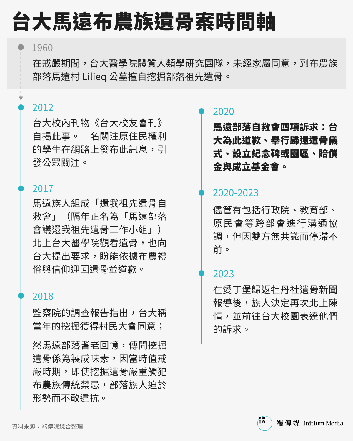 1960年,台大醫學院體質人類學研究團隊,在未經家屬同意的情況下,到布農族部落馬遠村 Lilieq 公墓擅自挖掘部落祖先遺骨。據2018年監察院報告,在當時馬遠部落爆發疫情(瘧疾、肺結核等等)的時空背景下,台大以清理環境衛生為由取走遺骨,基本上沒有文件證明部落族人同意此舉。
