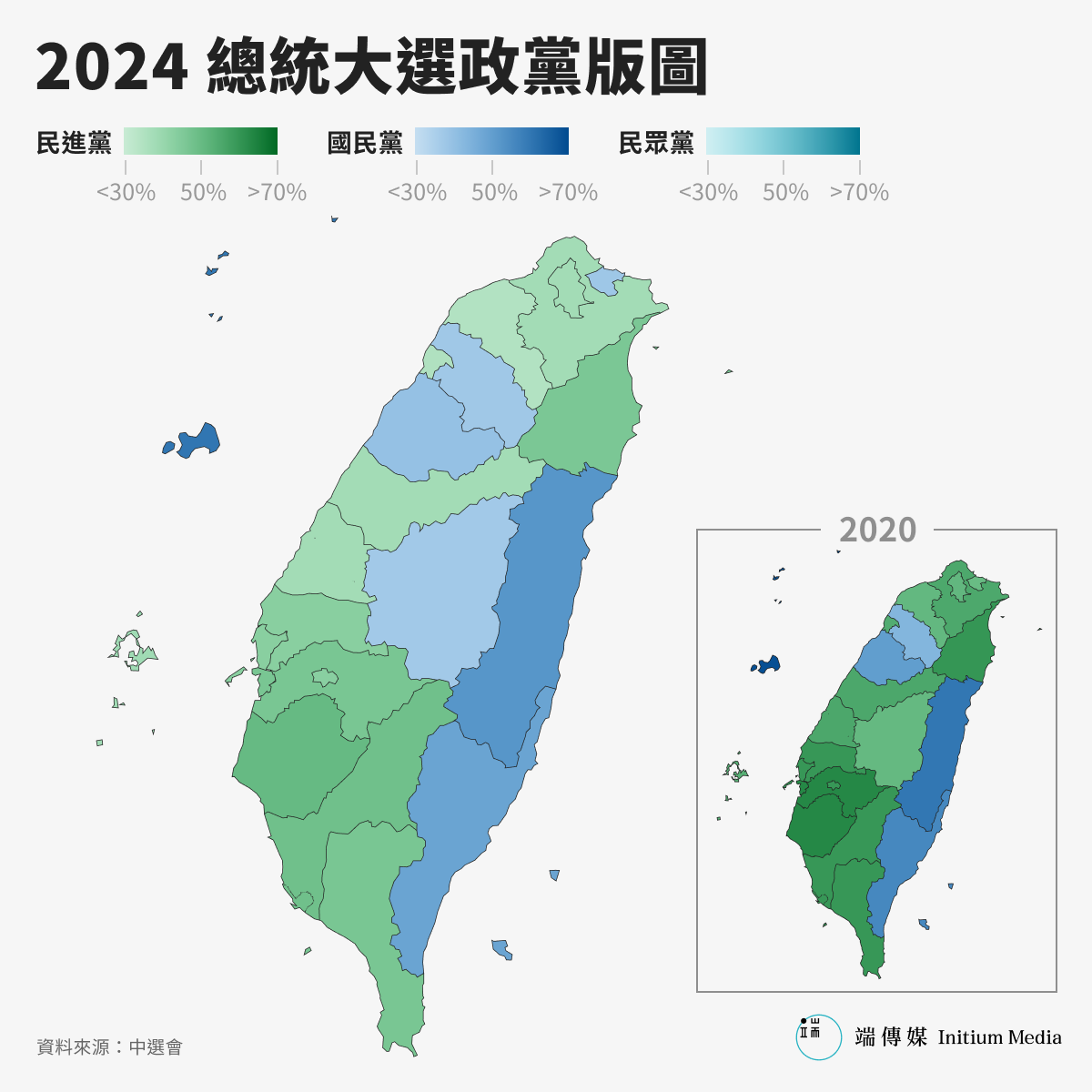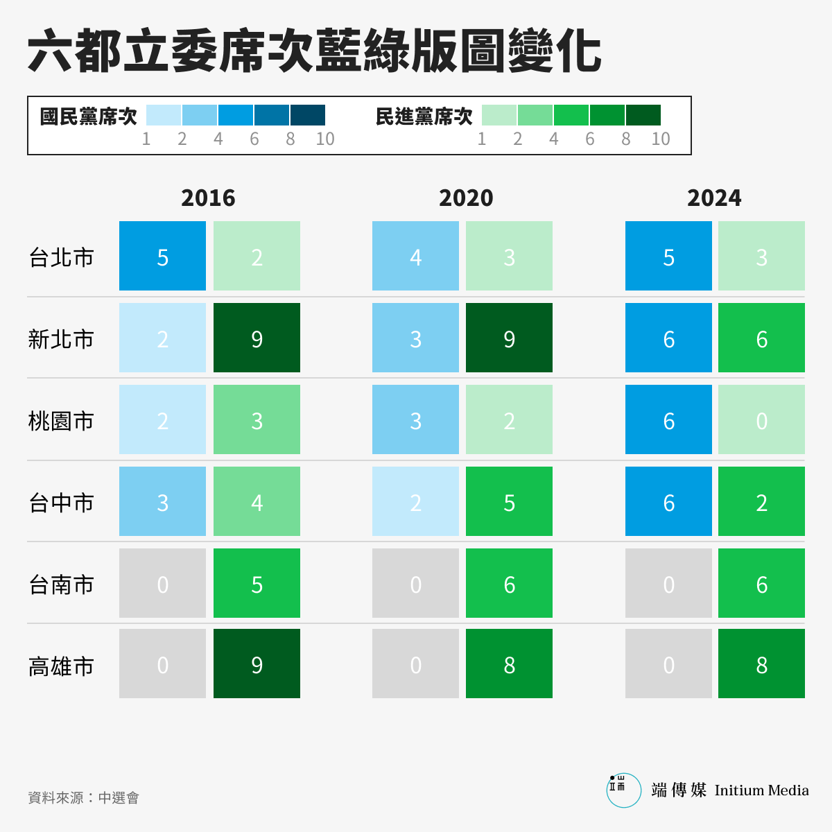 而在全台縣市的藍綠版圖上,相較2020年,民進黨在總統的選情中南投縣、基隆市由綠轉藍,其餘縣市並未出現翻轉。在六都立委席次部分,民進黨在台南、高雄擊出「全壘打」,無論是台南六席、或是高雄八席,全數席次由民進黨奪下。