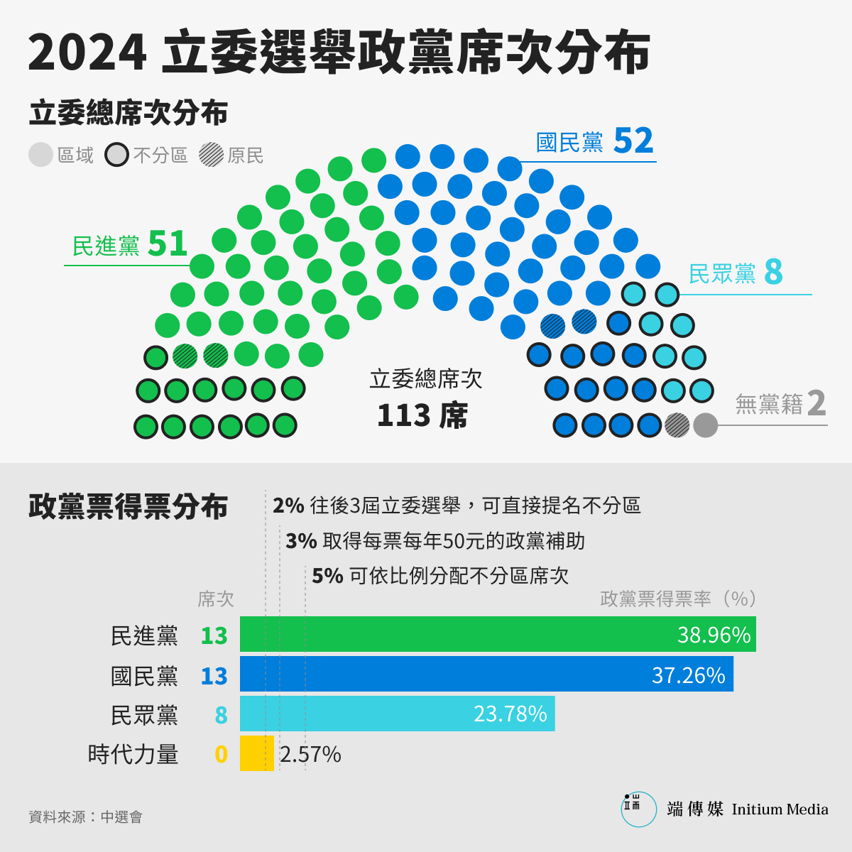 此外,民眾黨則至少在不分區奪下八席,在賴清德當選後的政治板塊,將是朝小野大的政局。在原住民(平地、山地)立委席次,國民黨獲三席、民進黨兩席、無黨籍一席。總計國、民兩黨國會總席次:國民黨52席、民進黨51席、民眾黨八席,以及無黨籍兩席。
