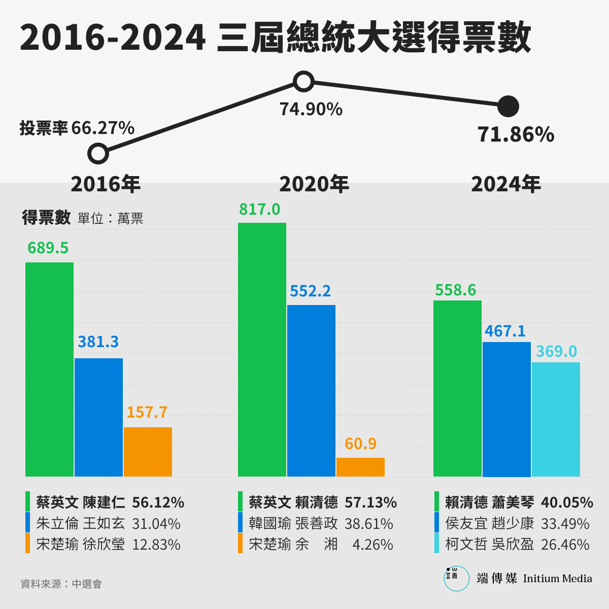 2024台灣大選總統選舉結果出爐。民進黨候選人賴清德、蕭美琴以得票數558萬票、40%得票率當選新一任正副總統,相較2020年蔡英文連任的817萬票、2016首度勝選的689萬票,甚至是2012年蔡英文首度參選的609萬票,賴清德在這年的得票相較過去三屆選情,不論在得票數或是得票率,兩數據皆呈現下滑狀況。
