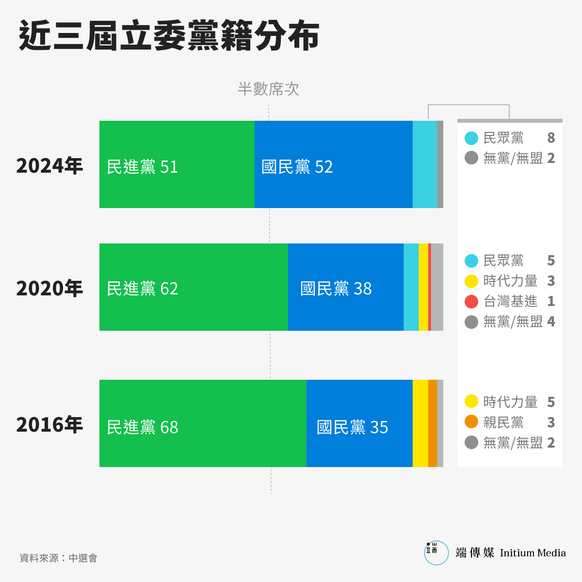 除此,在國會選舉結果,區域立委席次73席,國、民兩黨各自奪下36席,藍綠在地方選情打平。而唯一一席無黨籍地方立委,則是苗栗縣第一選區由無黨籍的陳超明當選。但民進黨的36席,相較2020年的46席來說失去十席,國民黨則由22席成長了14席,加上友好的高金素梅、陳超明,穩坐國會第一大黨。
