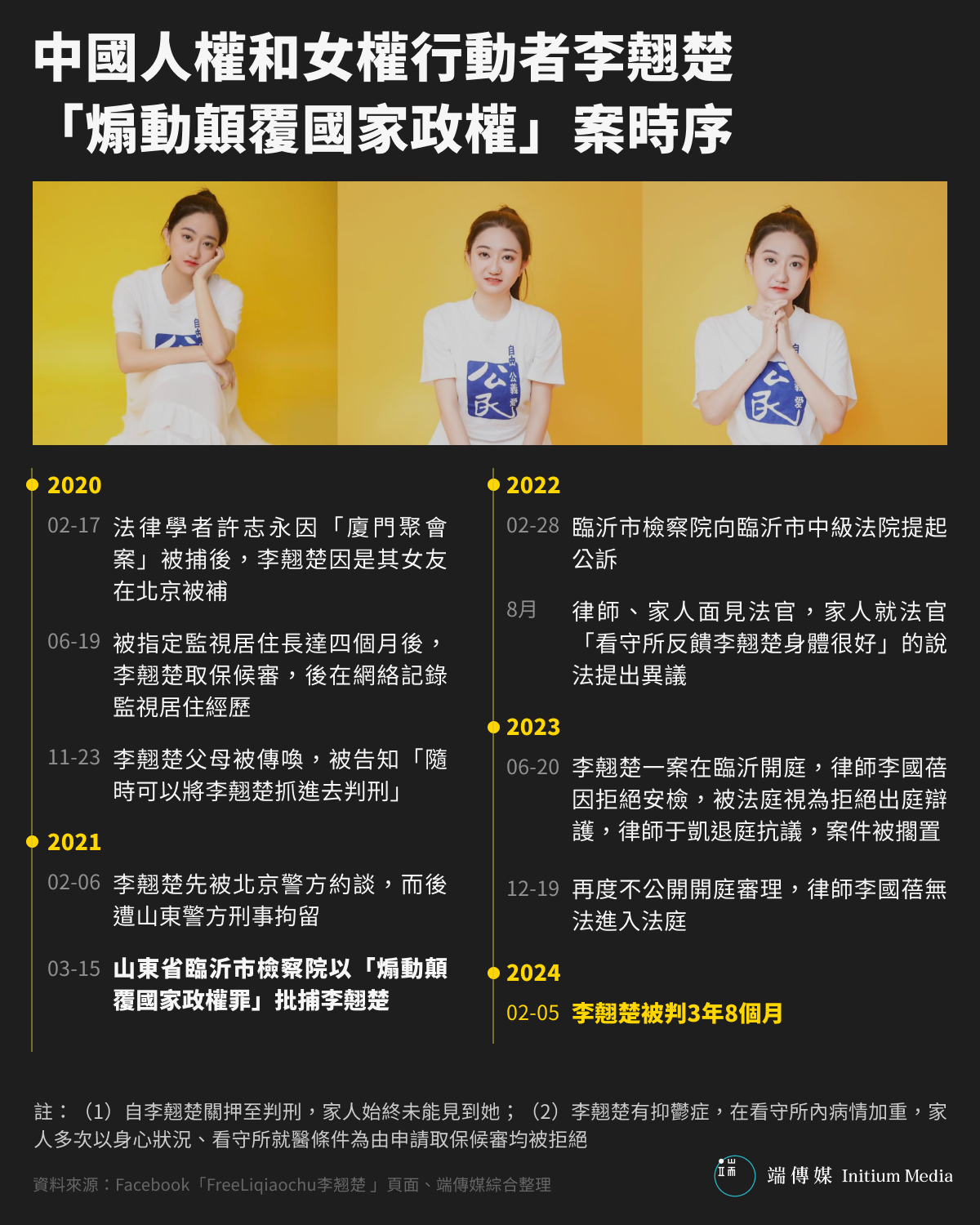 2月5日,中國人權和女權行動者李翹楚因「煽動顛覆國家政權」罪被山東省臨沂市中級人民法院判處有期徒刑3年8個月,剝奪政治權利2年。