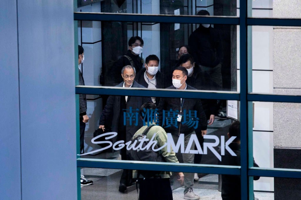 直至傍晚時分,鍾庭耀和另外兩位職員被帶離辦公室,他們未被扣上手扣。警方至少帶走6箱物品和數部電腦硬碟。