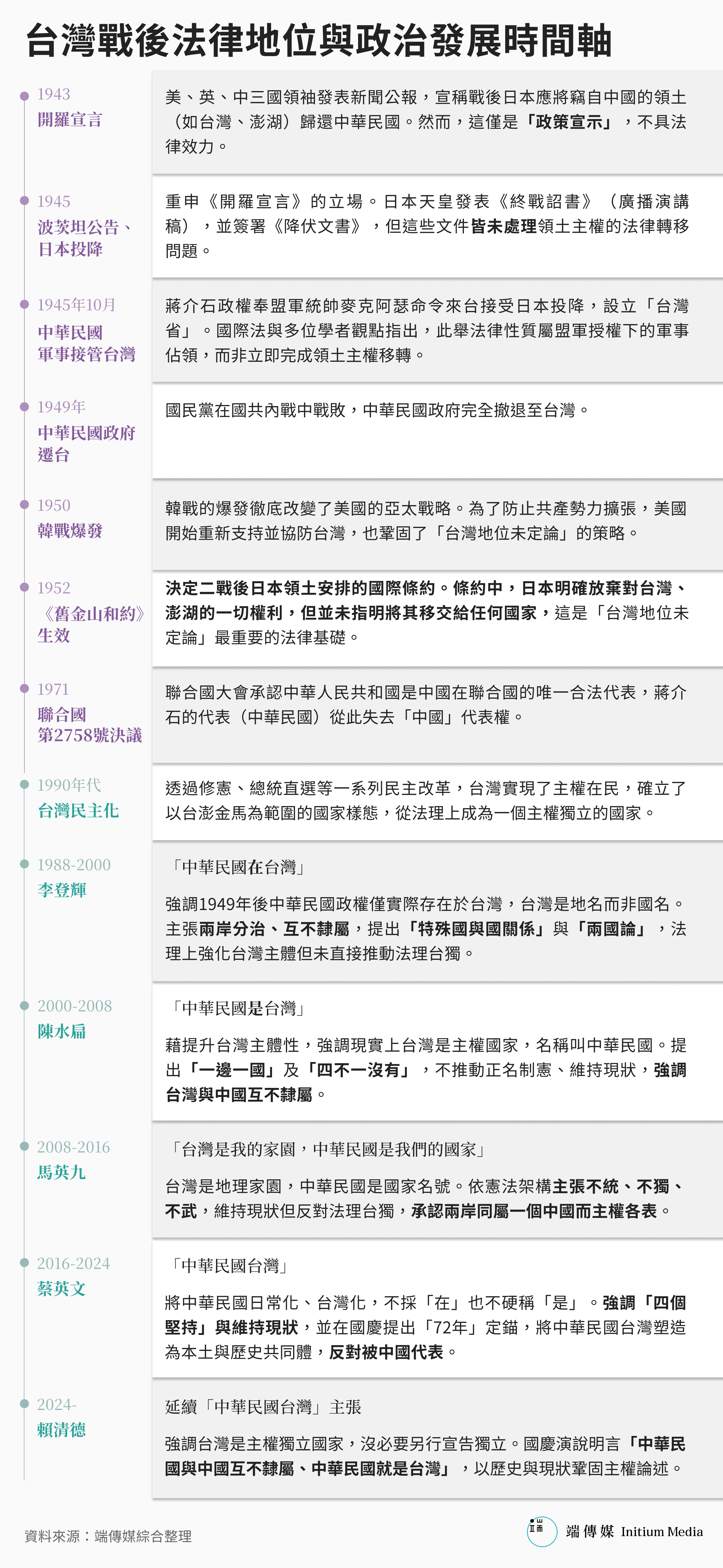東吳大學政治學系助理教授陳方隅對端傳媒解釋,許多人認知的「1945年台灣光復、回歸中華民國」其實是一個不符國際法事實的歷史迷思。他說明,二戰期間的《開羅宣言》與《波茨坦公告》,本質上僅為同盟國領袖的「政策宣示」新聞稿,不具備領土主權移轉的法律效力。