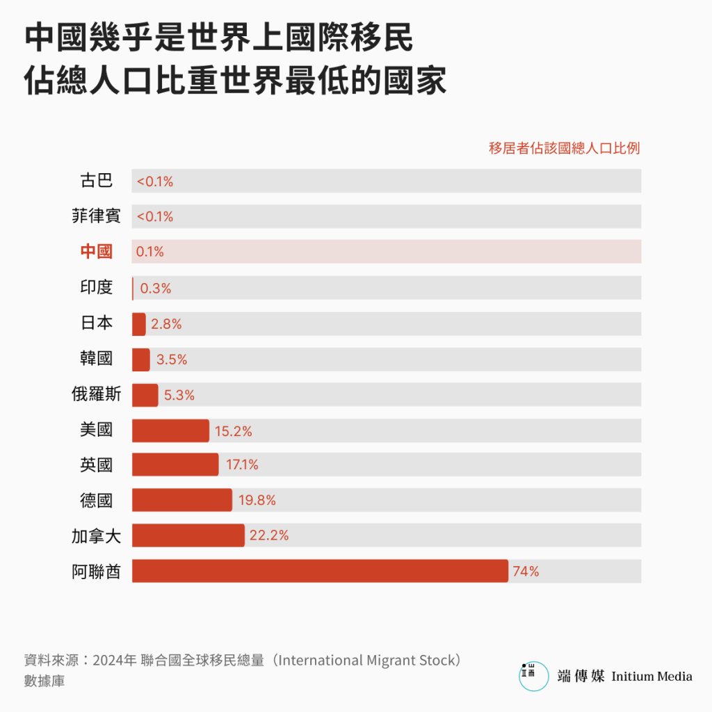 而與這些以引進移民為競爭力的國家相比,中國的外籍人口比例極低。2024年,聯合國估算,外國居民僅佔中國總人口的0.1%,遠低於東亞平均值0.7%,在全球排名倒數第三——僅高於古巴與菲律賓。