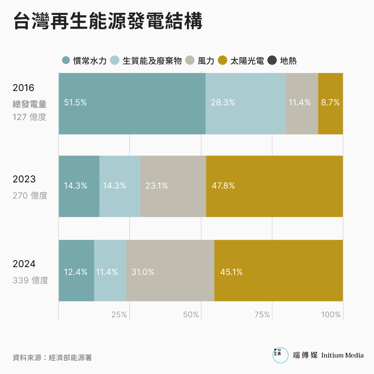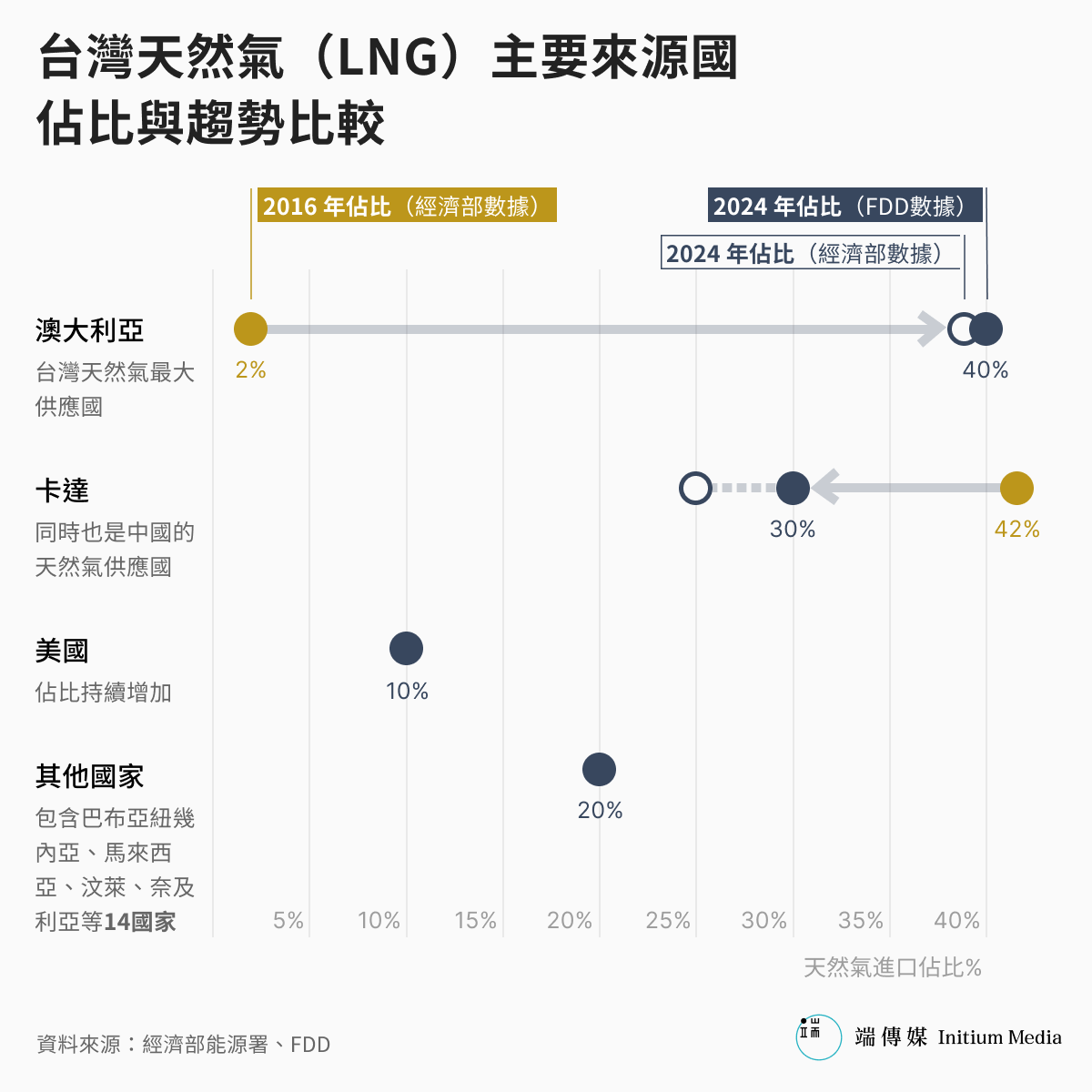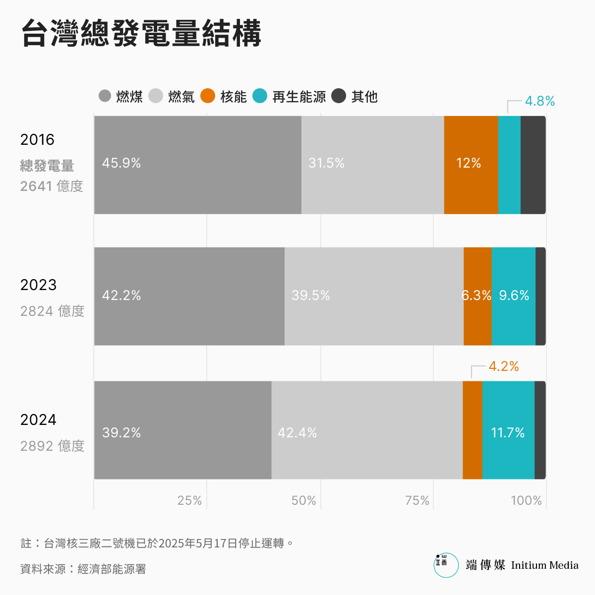 台灣現階段主要電力來自火力發電,2024年的數據顯示,燃氣發電佔比約42%,燃煤則為39%。為滿足龐大的發電需求,台灣去年進口了2113萬公噸的液化天然氣,以及超過2200萬公噸的煤炭。這使得台灣的「進口能源依存度」(指能源總供給中依賴進口的比例)長年超過95%,若單看石油及天然氣,依存度更是驚人的99%。