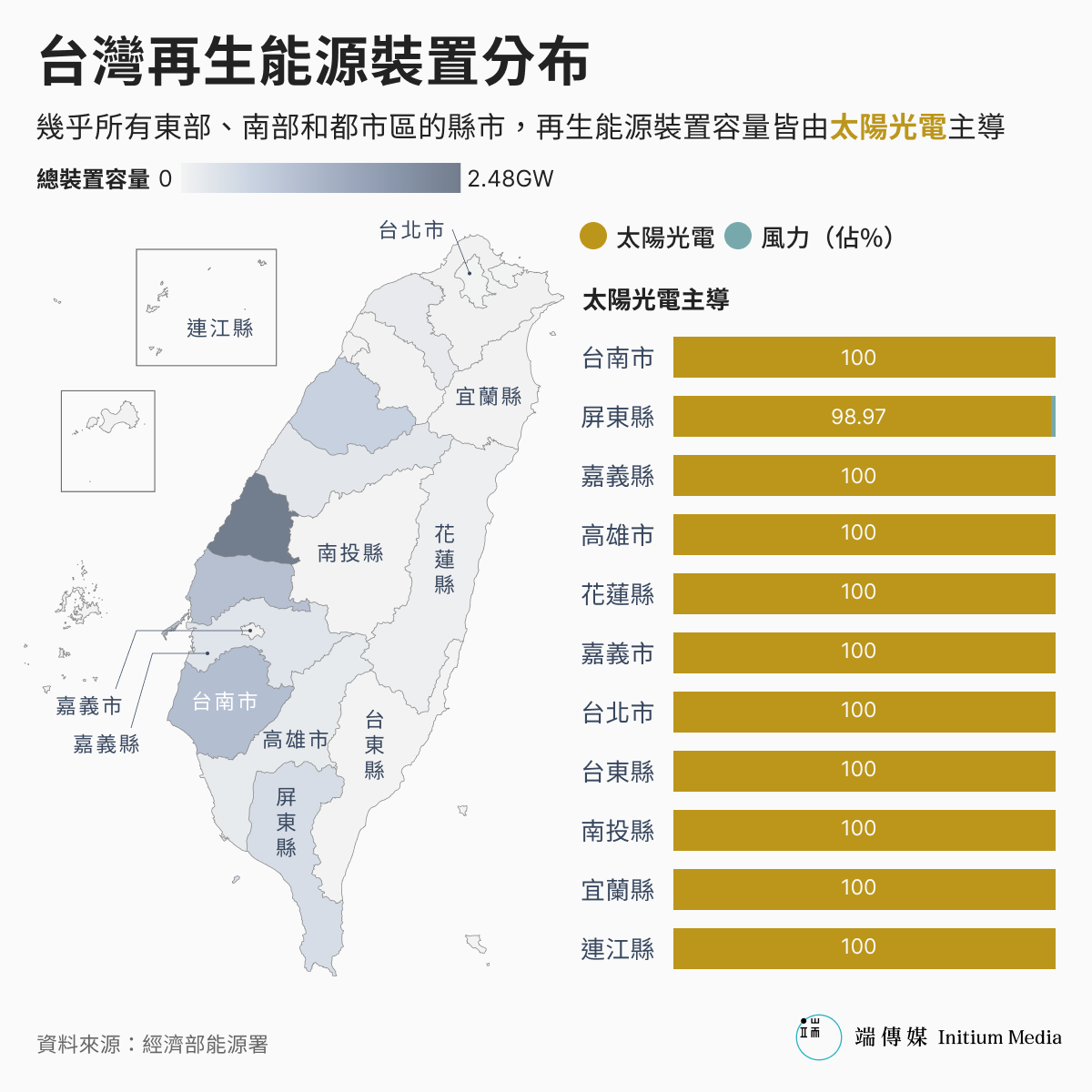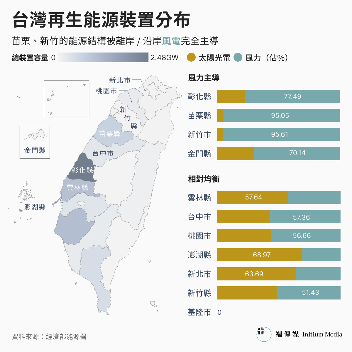 換句話說,以火力、核電廠為中心的電力結構,雖然發電效率高,卻也容易在電網其中一個環節故障時失去平衡、引發大規模停電。以太陽能、風力、儲能為主的分散式電力結構,能與鄰近供電及用電戶組成供需平衡的電力系統,即使主要對外輸電線路中斷,也能持續發電。