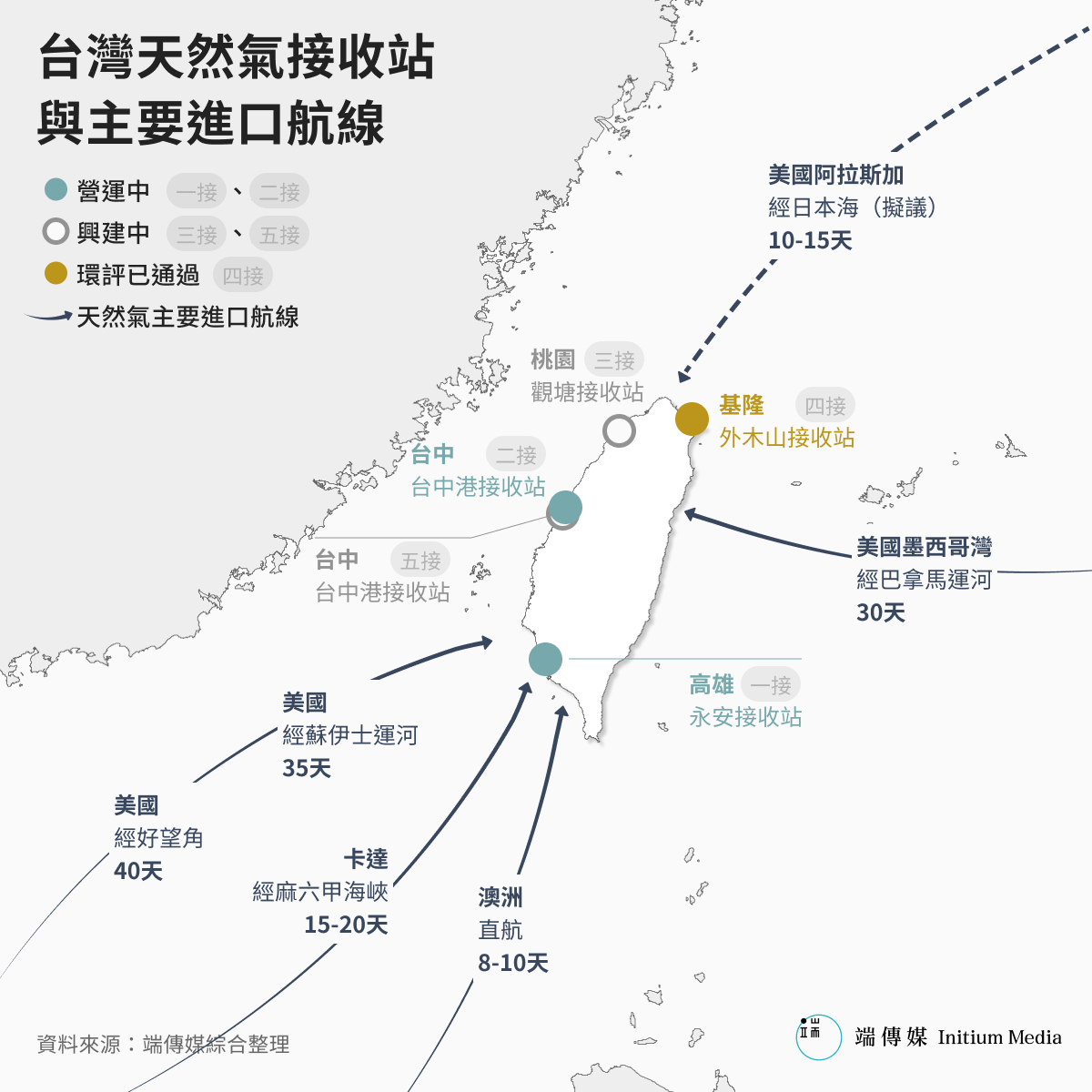 數千萬噸天然氣進口的背後,是一條繁忙卻纖細的海上生命線。每年超過300艘巨大的天然氣船停靠中油的台中及永安接收站,將液化天然氣卸入儲槽,再經由管線輸送至各地電廠。