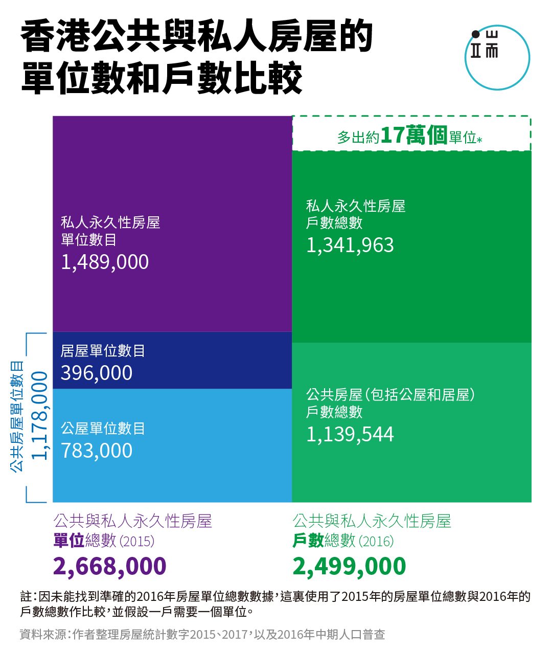 因為未能找到準確的2016年全港單位數目數據, 這裏使用了2015年的單位數目與2016年的總戶數作比較。根據圖一,香港2016年的總戶數大約是250萬戶,也就是說,2015年全港房屋單位總數(約267萬)比2016年的全港總戶數要多出約17萬間。如果每戶以2.7人(2016年公屋每戶平均人數)計算,17萬個房屋單位就可以住大概46萬人。這兩年建設的房子更多,理論上可以容納更多人。