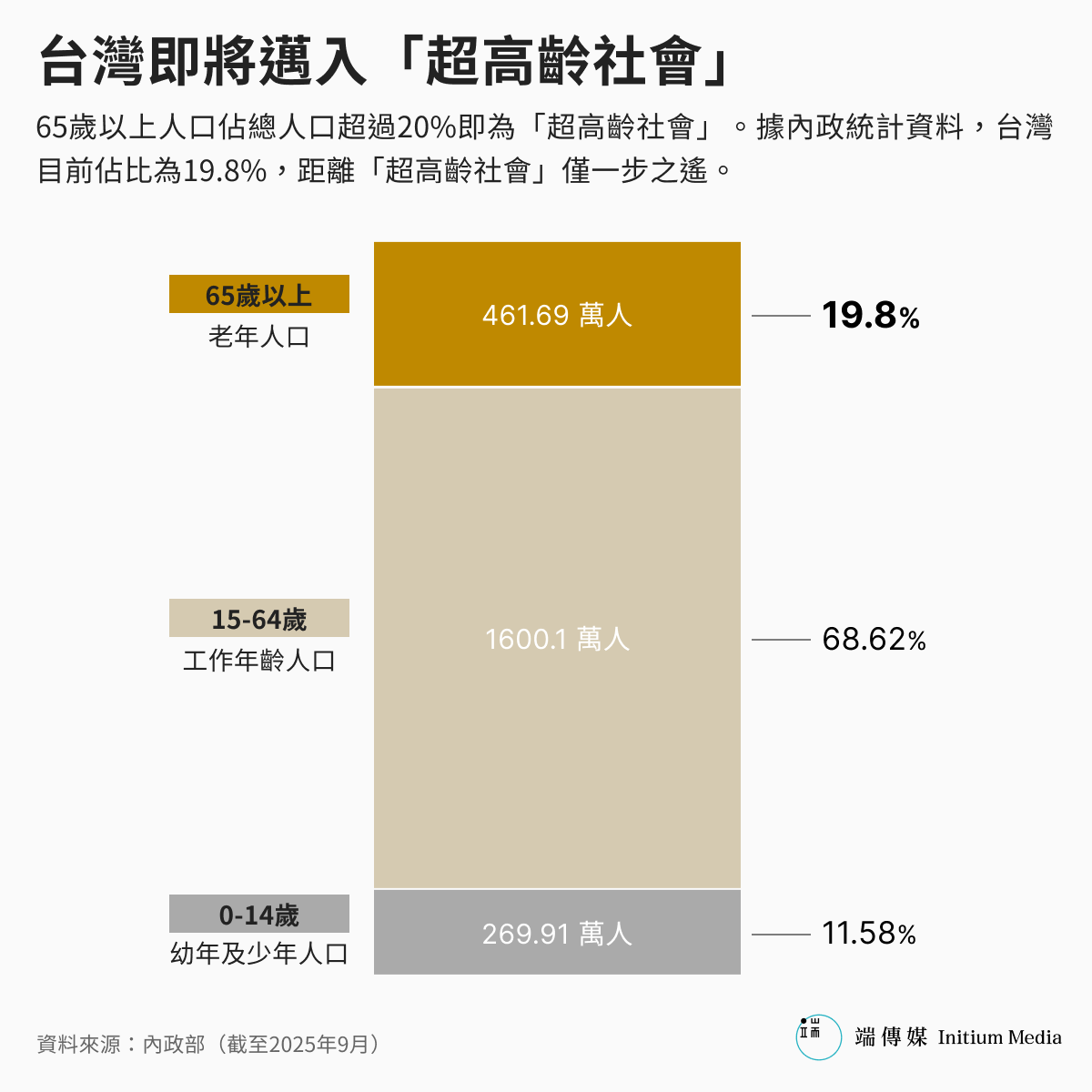 台灣社會的老化,幾乎是在人們還來不及反應時,便迎面撞上。1993年,依據世界衛生組織(WHO)的定義,台灣步入「高齡化社會」(老年人口占總人口比例高於7%);2018年,跨入「高齡社會」(高於 14%)。在今年9月底,據台灣內政統計資料顯示,65歲以上人口佔比已是19.80%,距離正式邁入「超高齡社會」——亦即65歲以上人口佔總人口超過20%——僅差一步之遙。這意味著,街上每五個人,就會有一位長者。