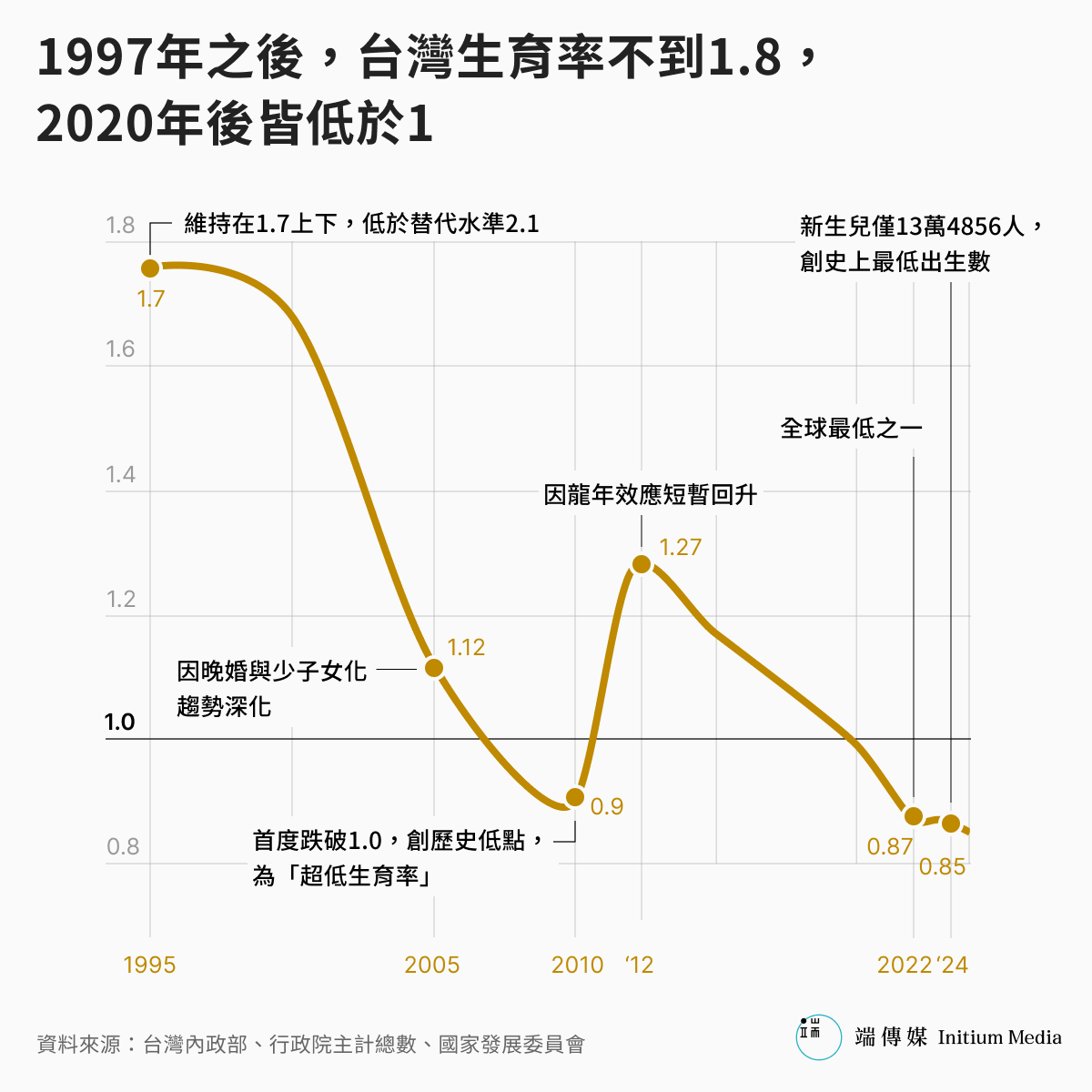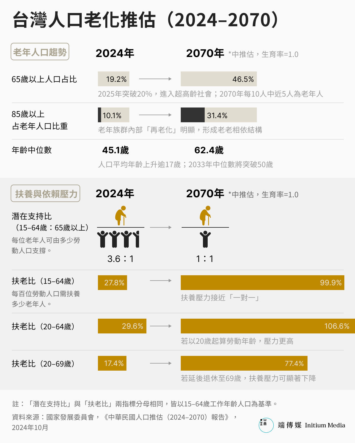此外,台灣的生育率長期低迷,近年來穩坐國際排名最末段,2024年的生育率僅0.87。國家發展委員會推估,用來表現社會扶養負擔的「扶老比」(每100個工作年齡人口所需扶養的老年人口數),將從2020年約5.4名青壯年扶養一名老人,惡化至2040年的2.7:1,到了2070年,更將趨近1:1的極限景況。此意味著,一個工作人口必須獨自負擔一名老人的生計。這是台灣社會不到50年後的將來。