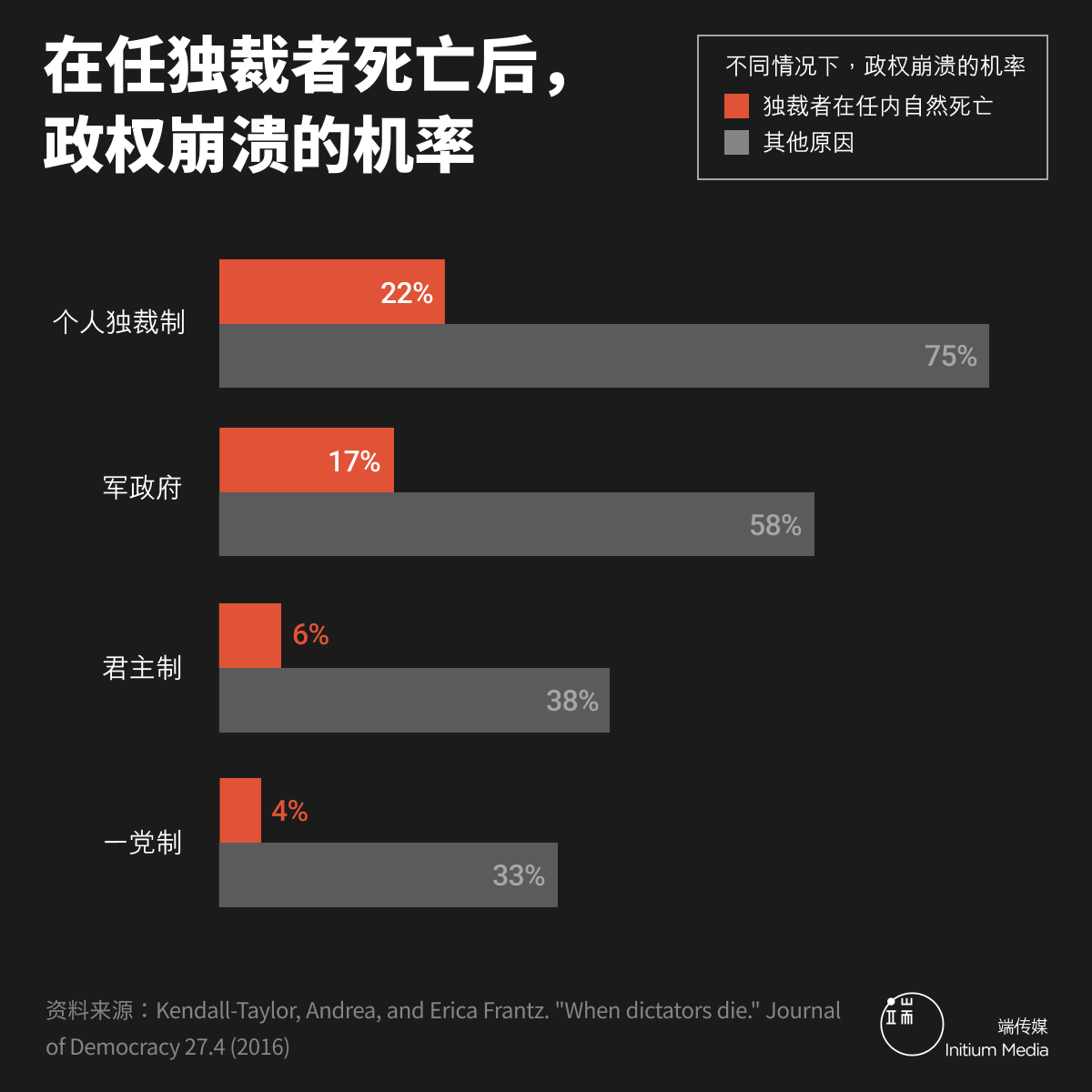 在2016年,两位美国学者(Andrea Kendall-Taylor 和 Erica Frantz)在研究独裁政权更替的时候,找来了1946年到2012年全世界离任的495名独裁者的资料。通过数据分析,她们发现,假如一名独裁者在任上是自然死亡(而不是死于危机)的话,不管这个人是如何的混蛋,如何不留余地在内外铲除一切威胁,如何的孤家寡人,没有继承者或继承程序,其政权依旧有很大概率能够保持稳定。