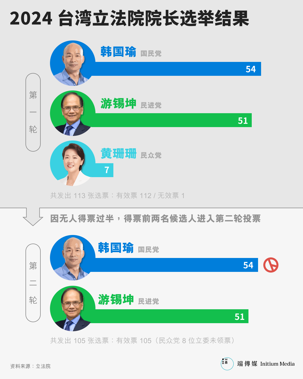 第二轮投票结果于下午1时45分出炉,共105人领票、剩余票八票(民众党此前已宣布不会参与第二轮投票),韩国瑜拿到54票、游锡堃获得51票,韩国瑜当选立法院长。